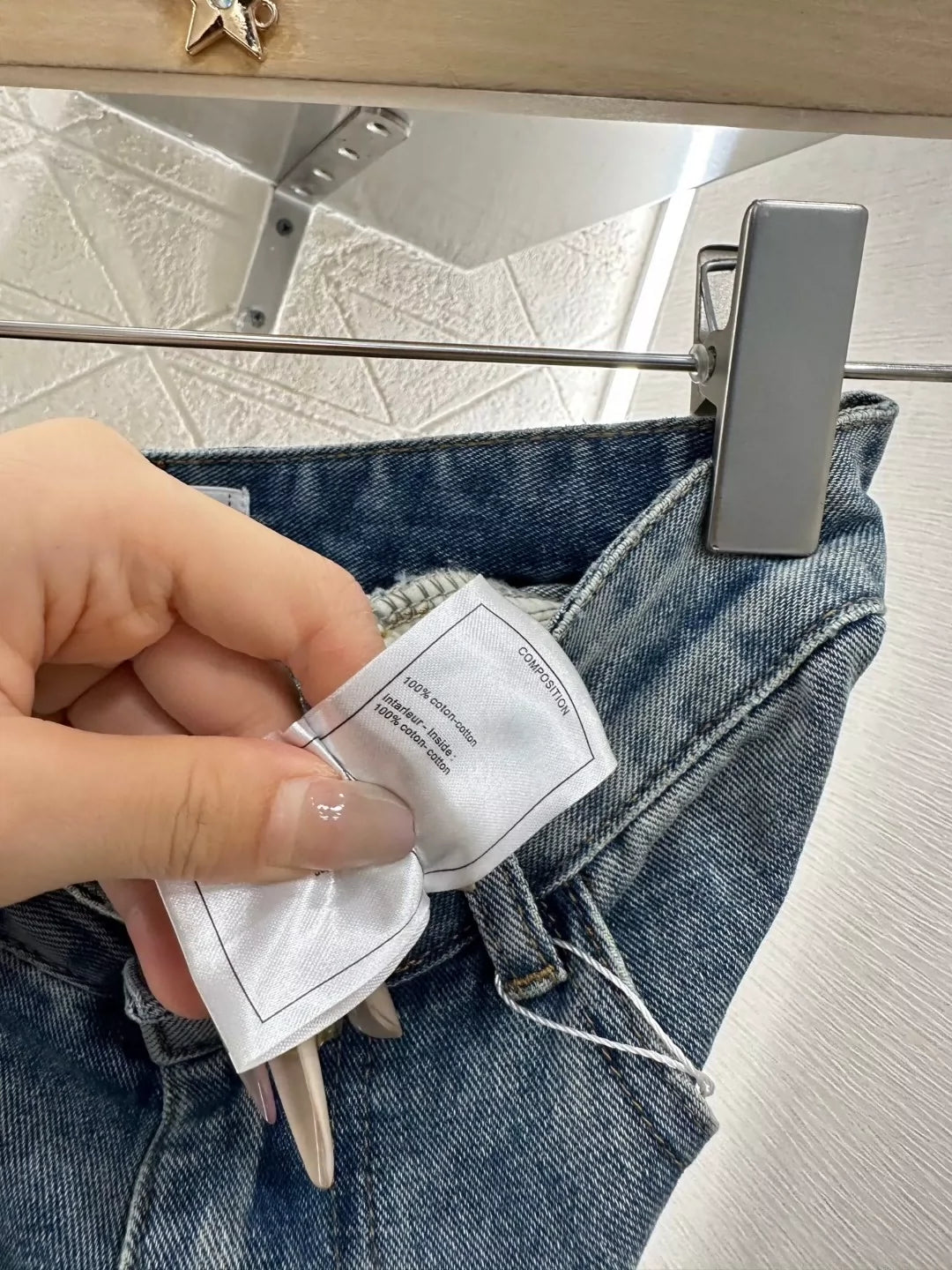 Twill-Baumwoll-Denim-Material, mehrfach gewaschen, mit fester Textur, ganz in hellblauem Vintage-Look, die Oberschenkel bis zum Knie stellen den natürlichen Aufhellungseffekt mit vollem Retro-Gefühl wieder her, die Spitzenumrandung erzeugt einen komplexen visuellen Effekt und unterstreicht den romantischen und ästhetischen Stil voller Persönlichkeit und Kreativität.