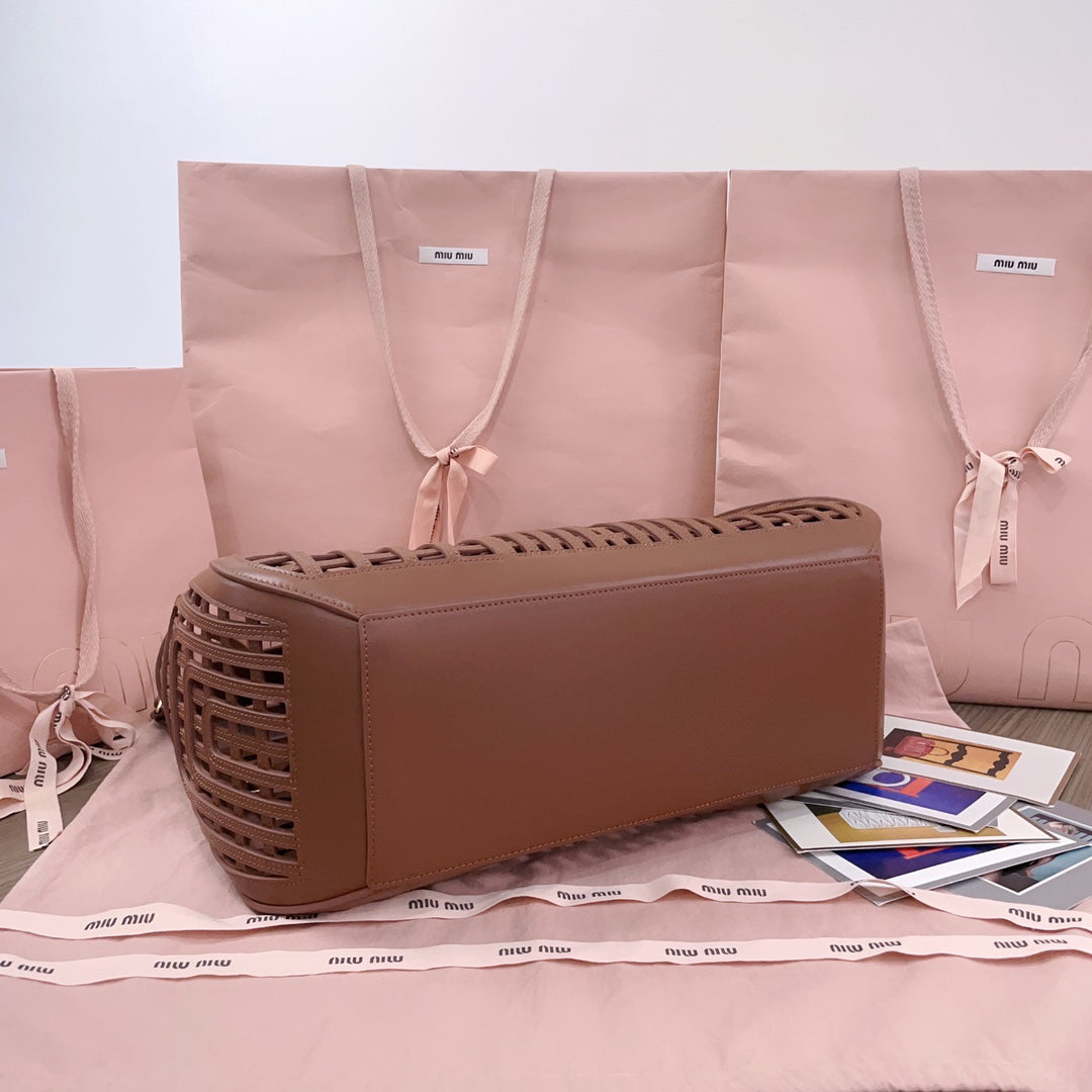 Weiches Naa-Leder mit exquisiten Webmustern und einzigartigem Strukturdesign unterstreicht den sommerlichen Stil. Die komplexe Verarbeitung spiegelt die exquisite und elegante Schönheit der M-Serie wider. Der abnehmbare und verstellbare lange Leder-Schultergurt ist mit einem kleinen Taschenanhänger mit Reißverschluss ausgestattet. Er ist äußerst praktisch und eignet sich hervorragend für den Weg zur Arbeit, ein Picknick oder den Urlaub.