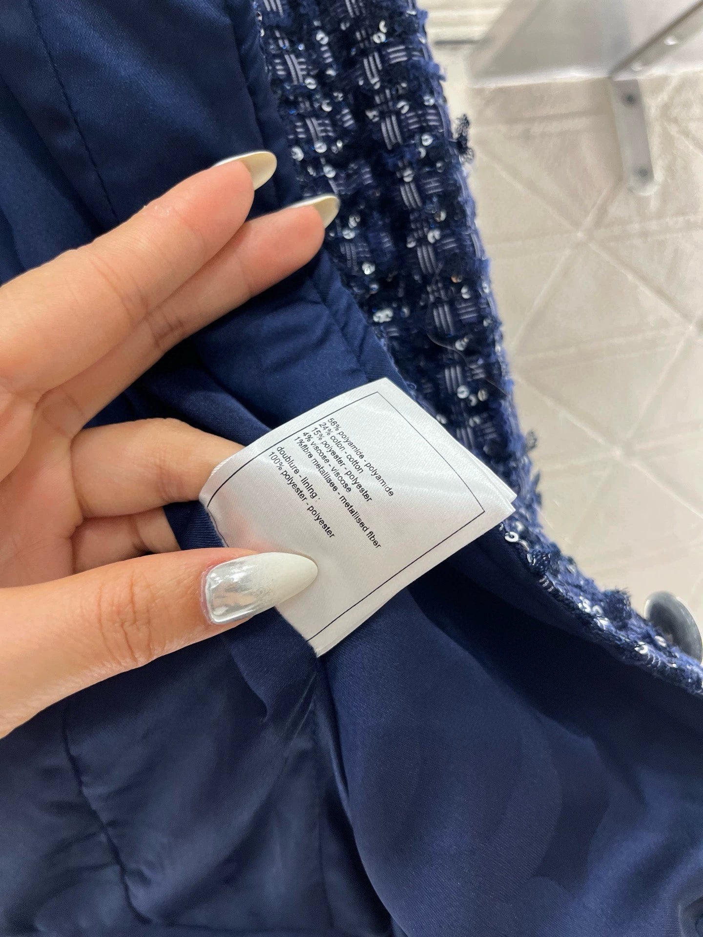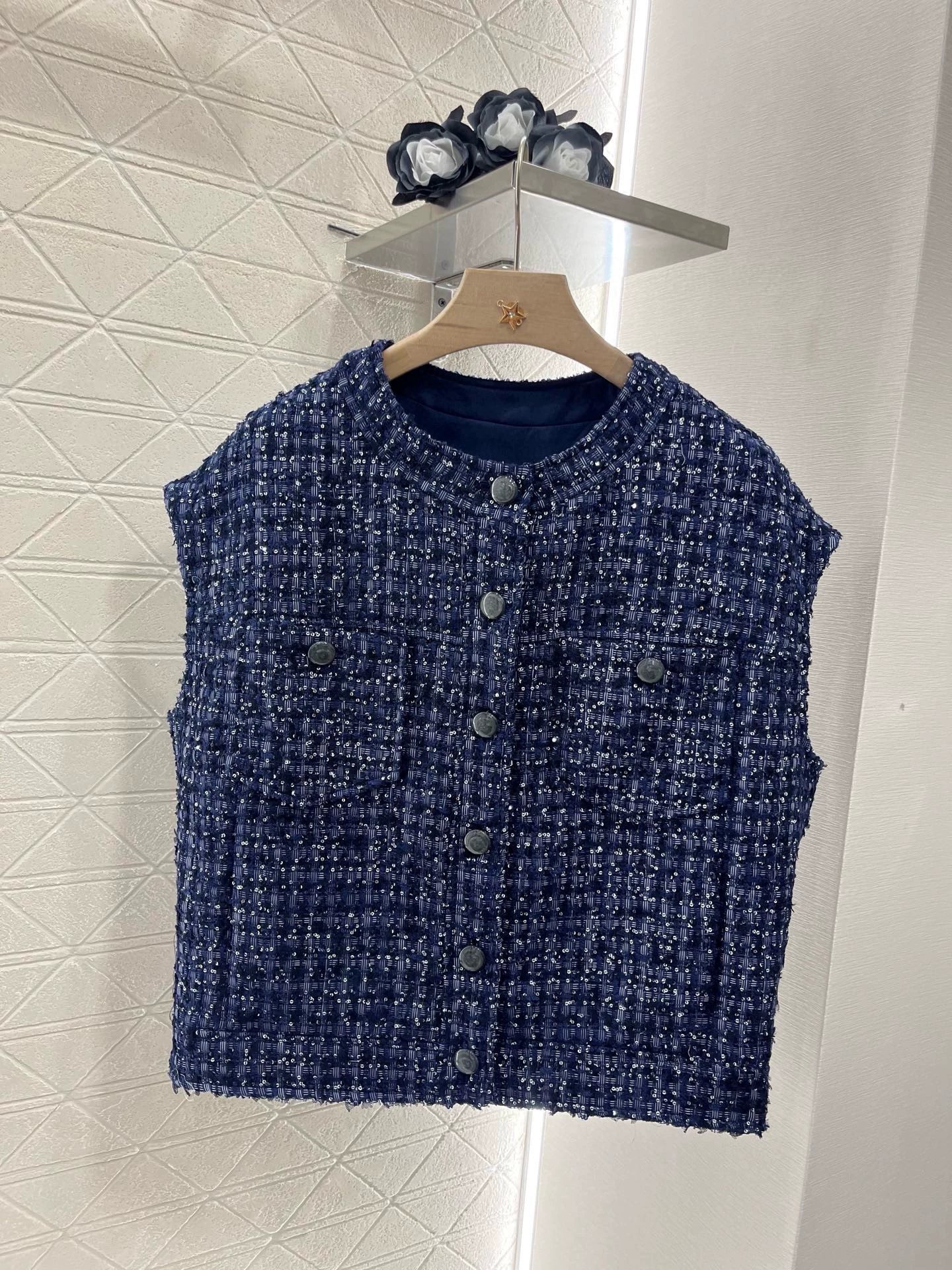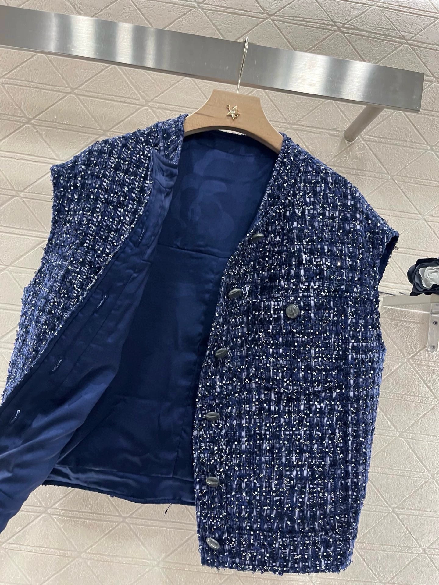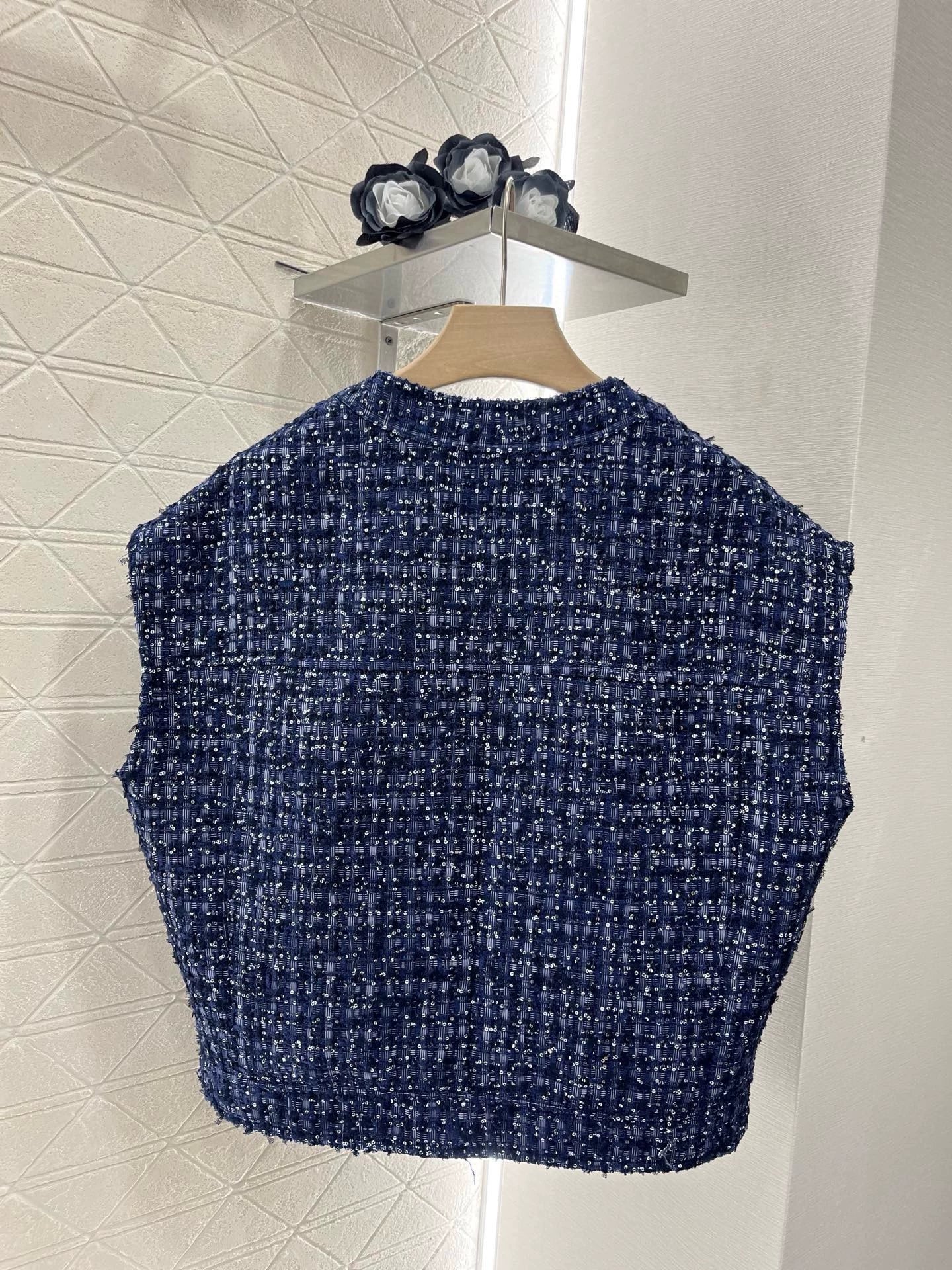Made from imported imitation wool, the texture is so pronounced that the wool is visible to the naked eye, creating a premium feel. This coarse, striped wool fabric creates a signature ladylike look. The single-breasted front features round-buttoned flap pockets. The exquisite blue-purple woven texture exudes luxury and elegance. Silver threads weave through the plaid, creating a shimmering, elegant, and captivating look.