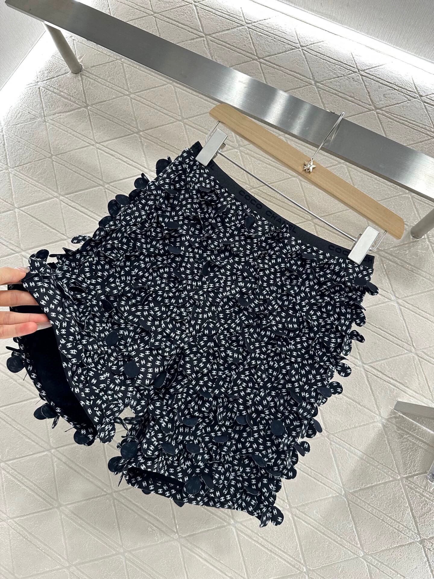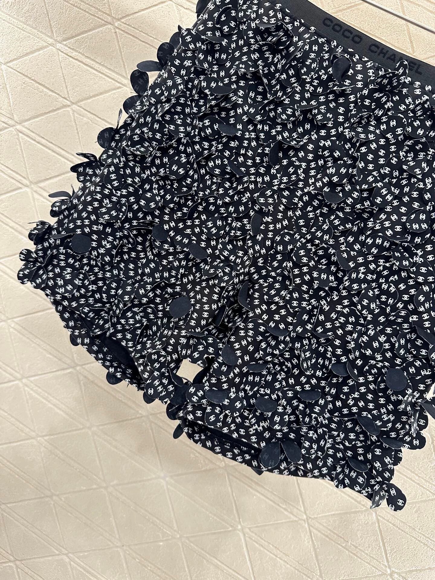 Custom YB imported material texture glossy high-grade comfortable high-waisted shorts cut body black and white optional full embellished with double C letters logo with three-dimensional petal-like shape full of incense home noble gorgeous style waist elastic letters webbing trim line cute reveal sexy taste high-grade texture full easy to become the focus of the vision make matching more glamorous vacation dating preferred custom fabrics and accessories authentic version high version