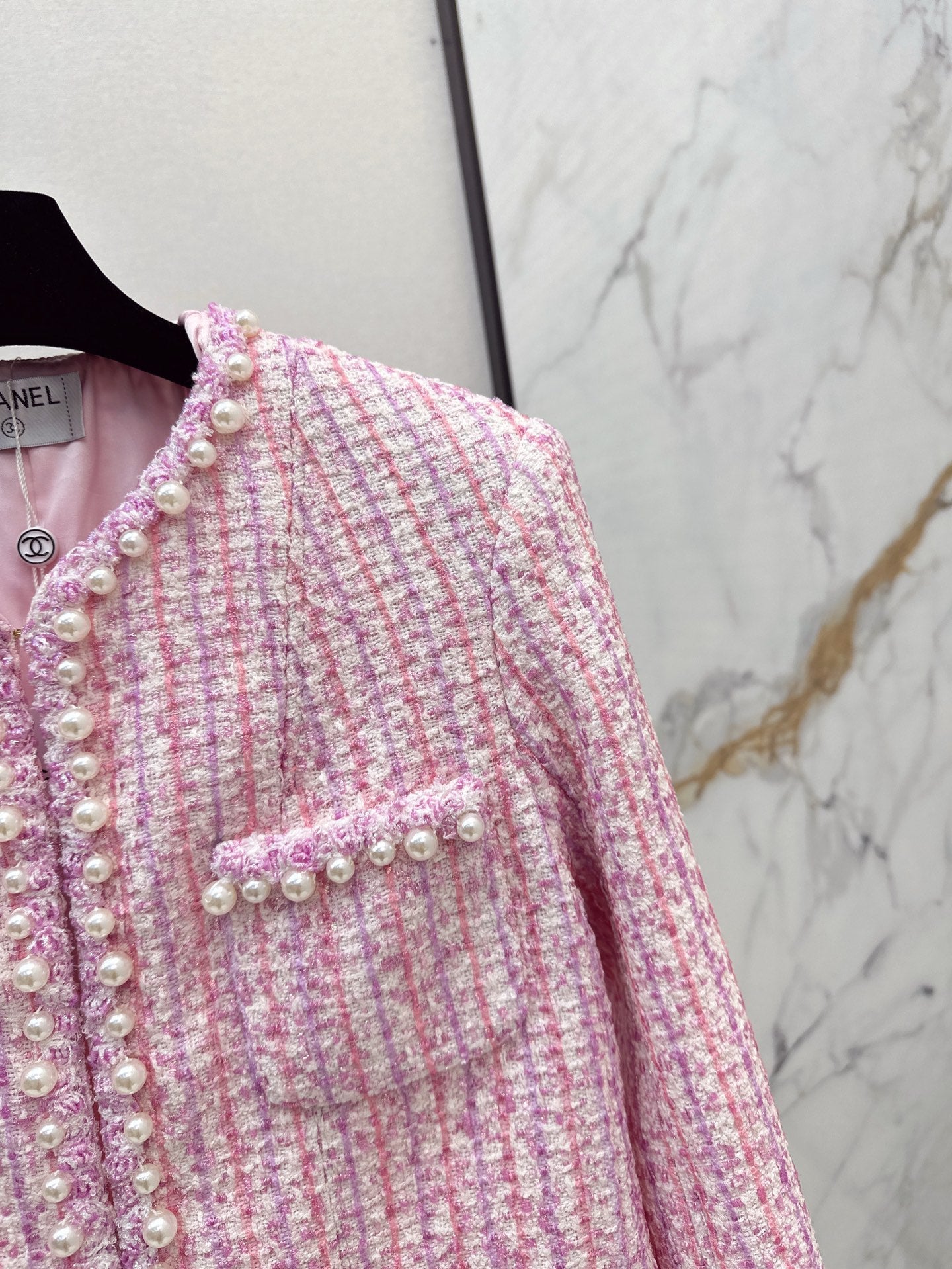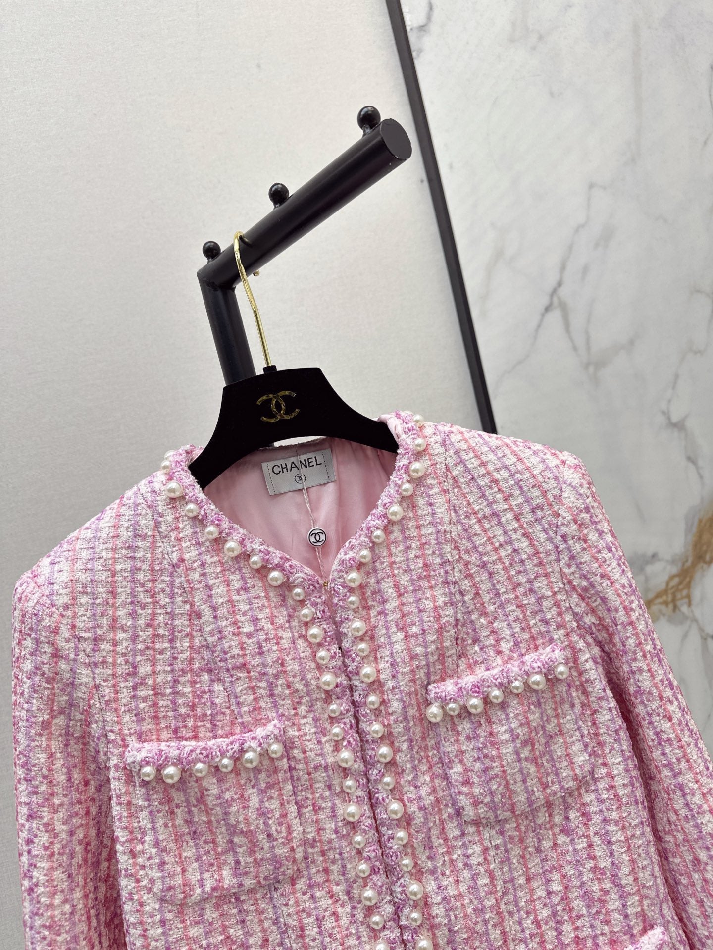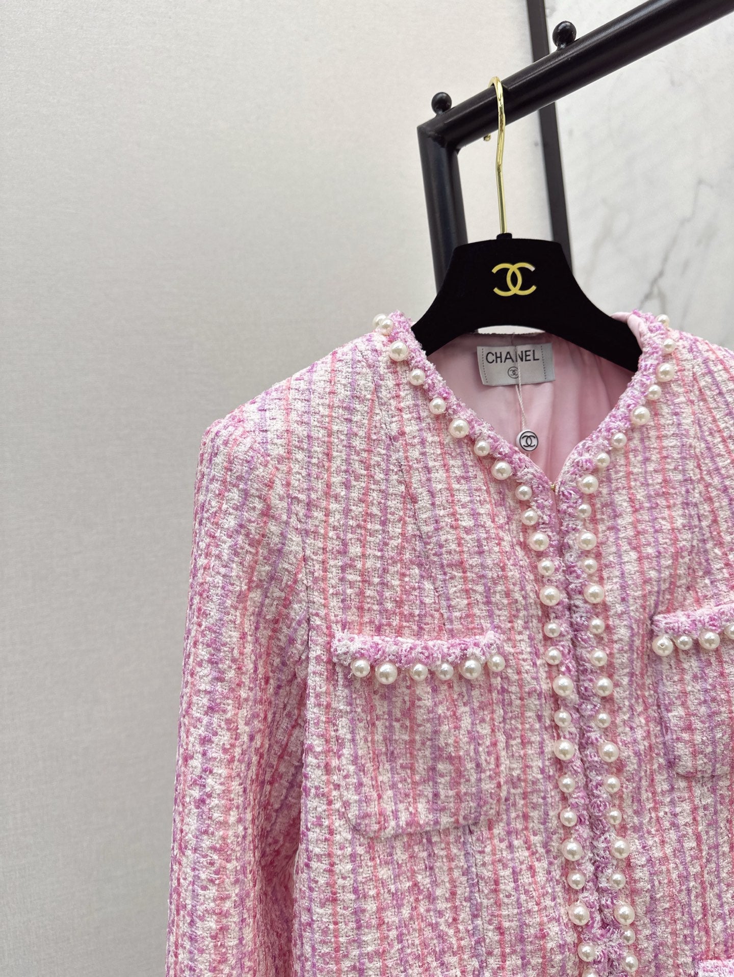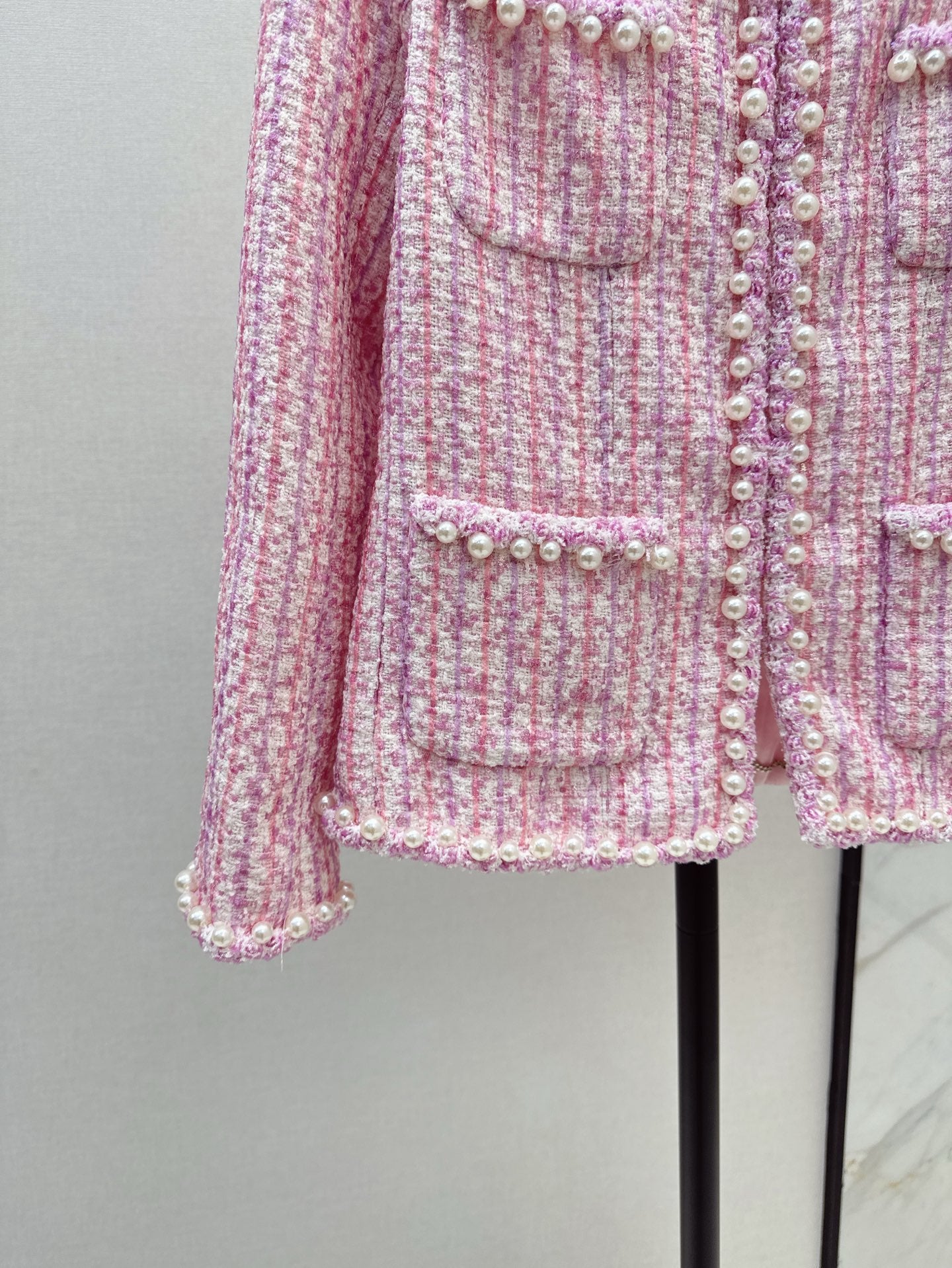 Product Description:The best must-have item of this season. Customized special yarn pink woven tweed soft tweed fabric. Purely handmade pearl inlay. Classic four-pocket cut for a slim fit. Temperamental lady girl style. A must-have for white, rich and beautiful women.