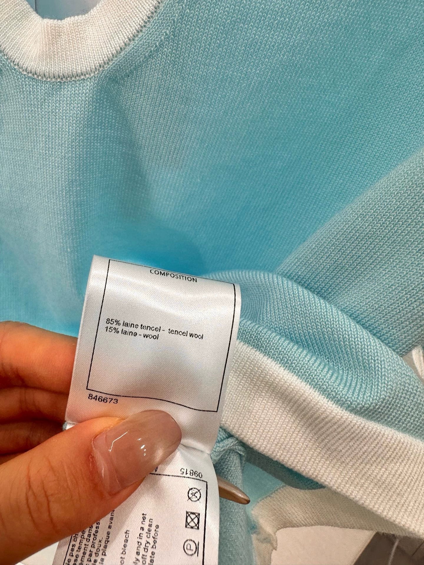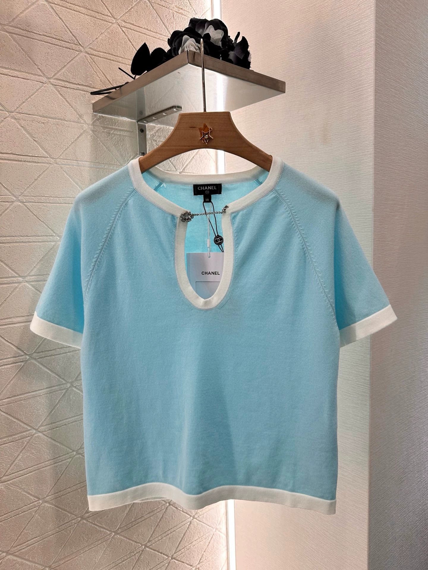 Wool yarns, fine texture, breathable comfort, short-sleeved knitted top and skirt set, with open front placket, adding a fashionable tone, with a white wrap around the body, creating a colorful layering, with a stretchy fabric, flattering and slimming. Versatile and versatile, not picking on age or skin color, with the same series of short skirts, symmetrical pockets embellished with molded placket buttons, unified details, more relaxed and resort-like style, and a set of suitably age-appropriate and fashionable styles.