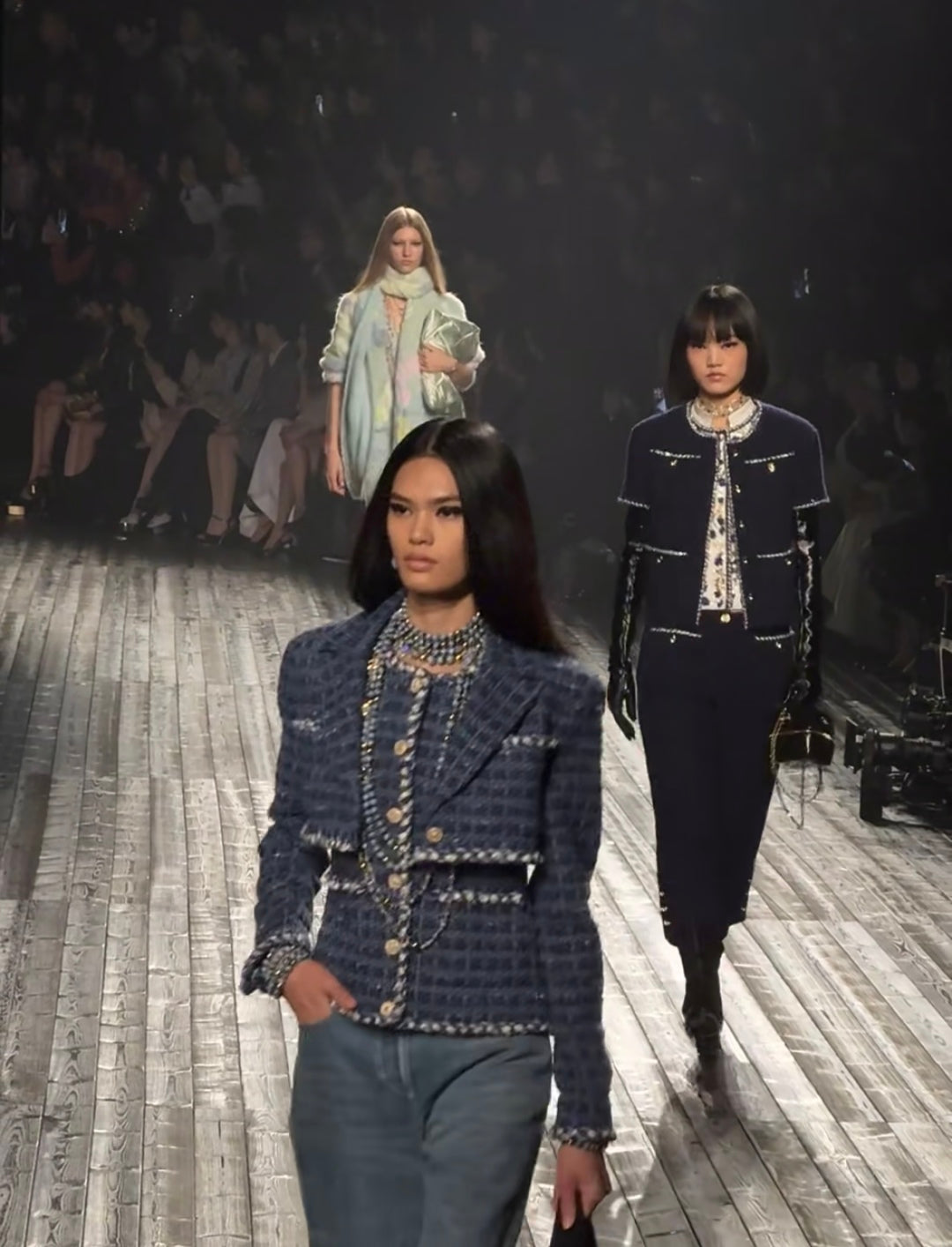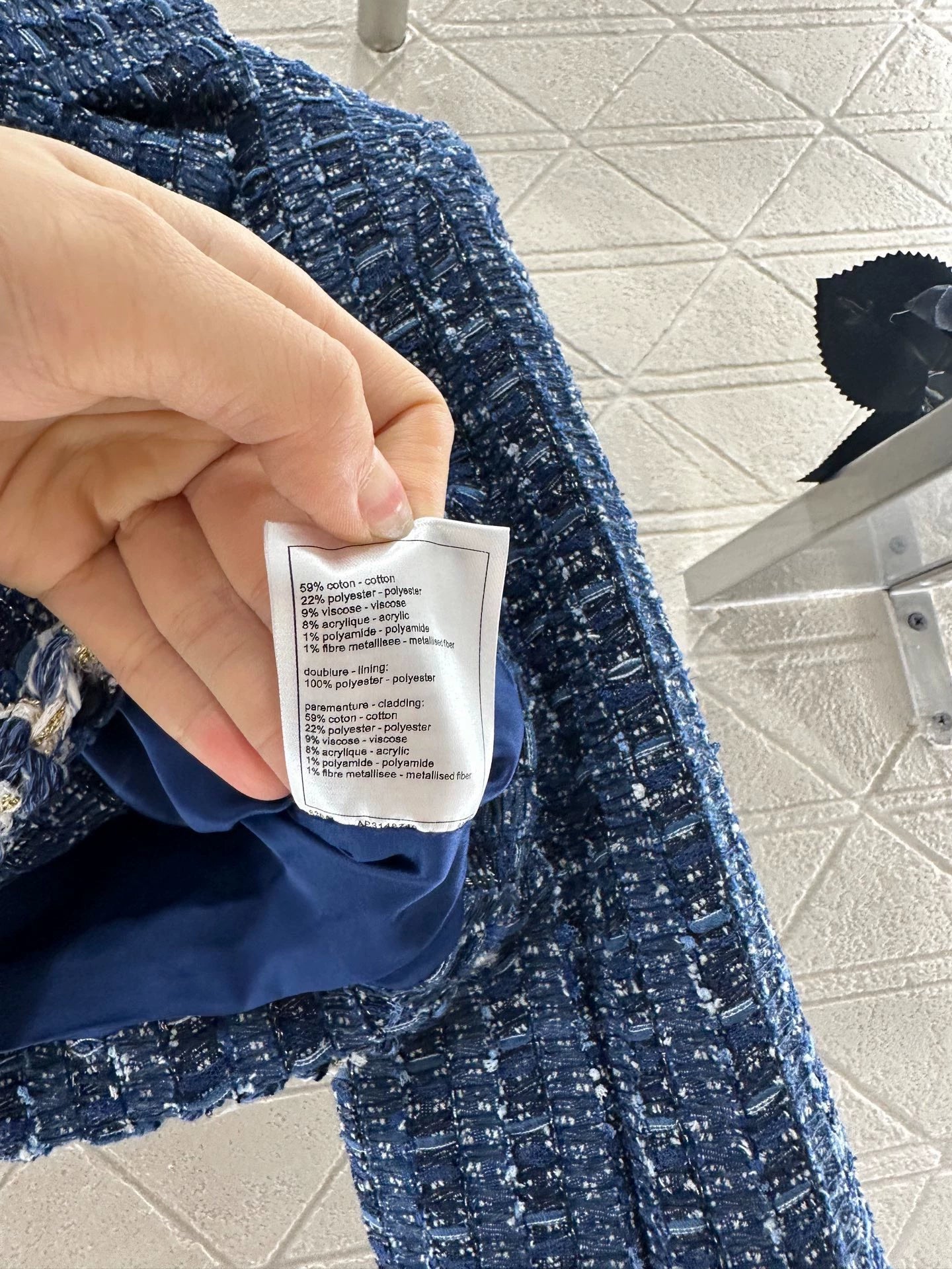 Custom-made YB imported woolen tweed, high-quality and in excellent condition. The dress jacket features a straight shoulder padded silhouette and a super-cropped fit that reveals the waist, enhancing the figure's slenderness and uprightness. The chest pockets, cuffs, and hem are embellished with 3D contrasting braided binding. The front placket is embellished with shimmering engraved round buttons. The delicate plaid texture creates a full-body, all-over look, creating a sophisticated and elegant look. This jacket perfectly captures the spirit of a wealthy woman, effortlessly chic. Custom-made fabrics and accessories. Look for the latest version.