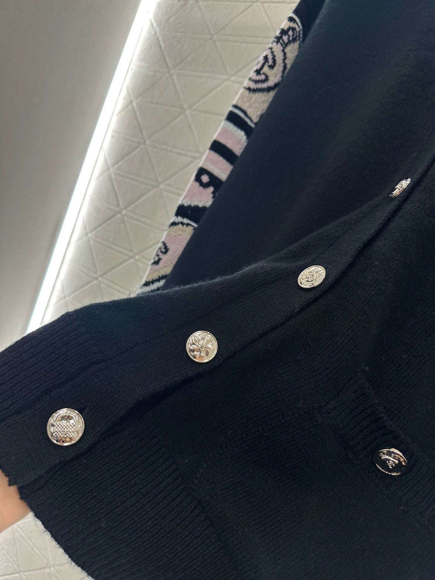 Custom wool knitted material, comfortable and fashionable, full of texture, V-neck cardigan tailoring, dense crochet throughout, black tone, durable and versatile, cartoon crochet patterns on both sleeves, eye-catching highlights break the dull routine, cartoon characters on the chest embellishment, exuding brand charm, commuting fashion focus wear