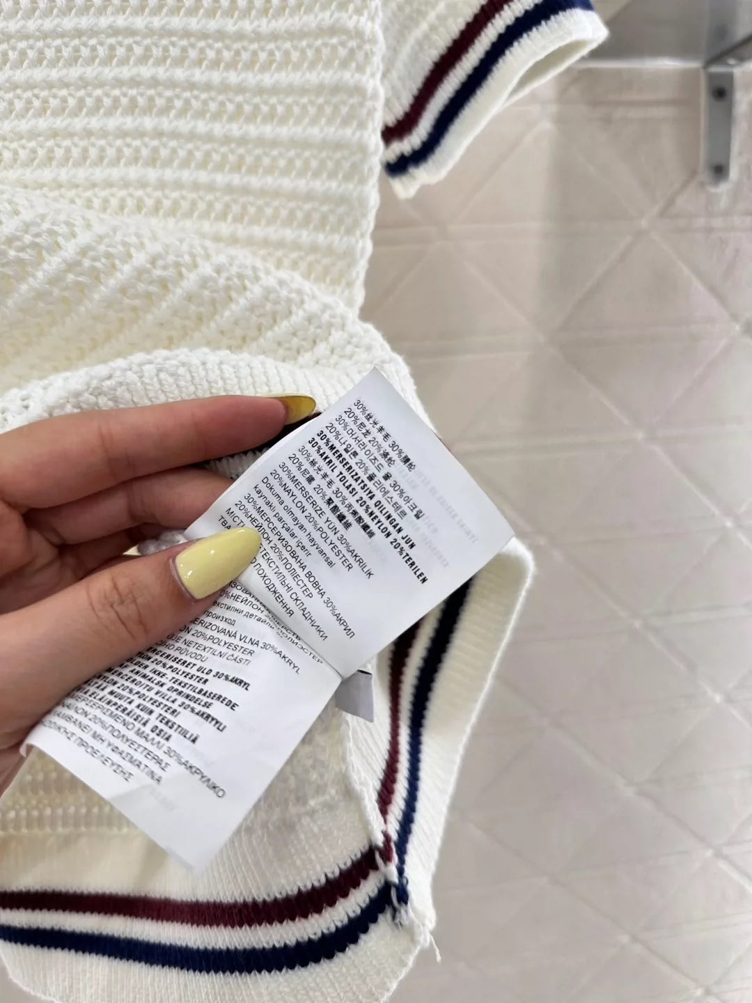 Woven with mercerized wool yarn, the texture is premium, breathable and comfortable Knit Crew Neck Top is cut with an openwork crochet texture throughout the body, outlining a striped line and floral pattern, highlighting the sense of high quality The collar, cuffs and hem are color-coded with blue and red threads, and the elastic elasticity is more delicate.