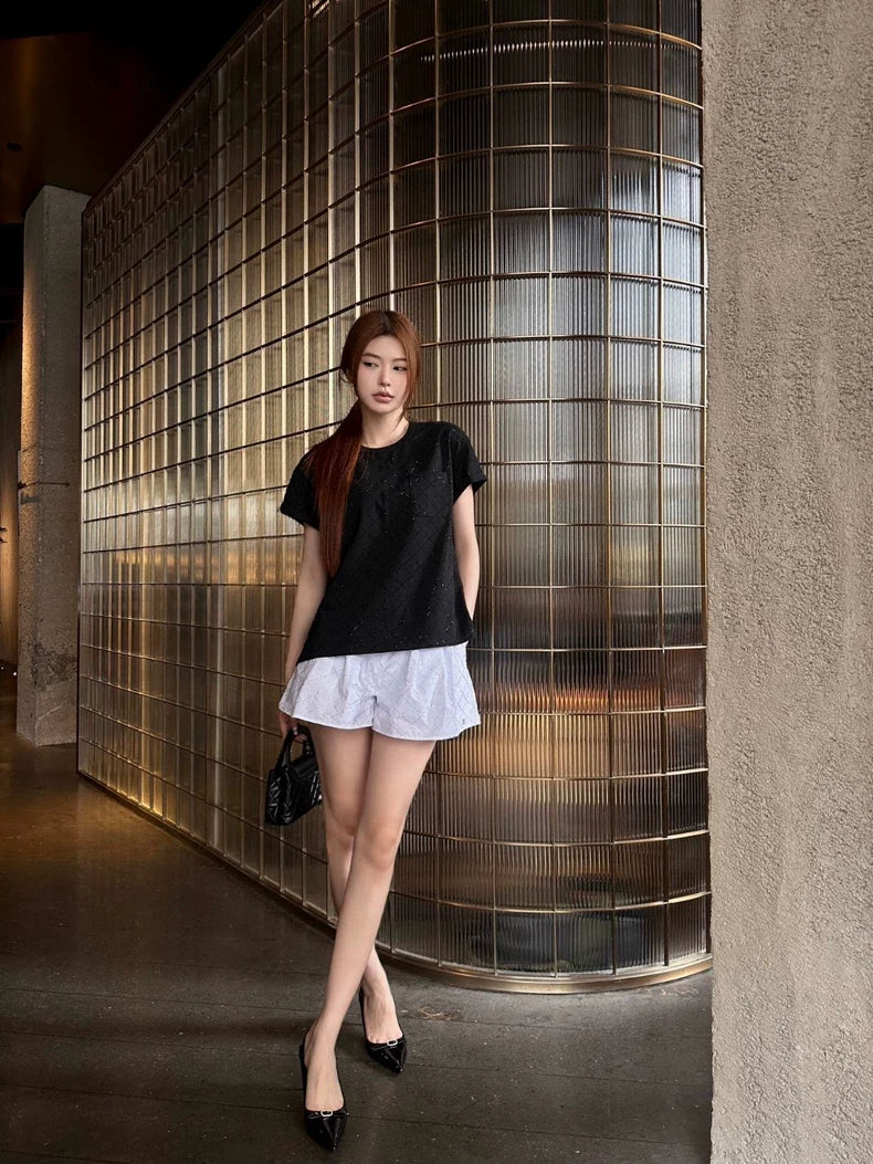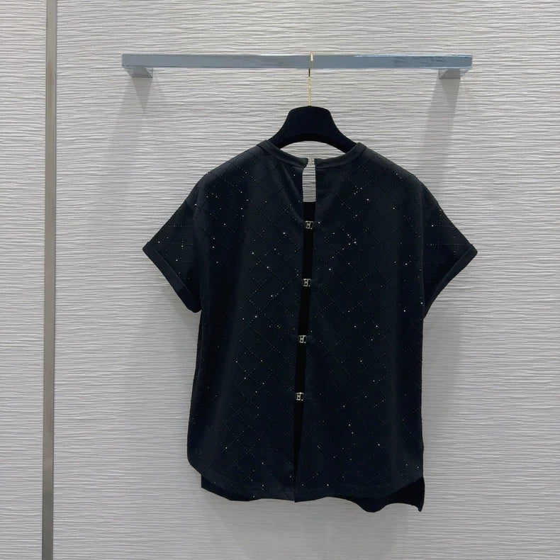 C 25 New Hot rhinestone diamond lattice pockets ageing round neck short sleeve(black,white)