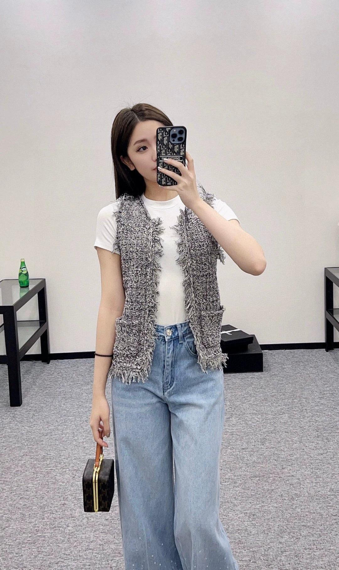 Cotton yarn weaving texture premium comfort round neck vest cut fine crochet texture decorative body ➕ cuffs hem front placket design with symmetrical multiple pockets show the shape of exquisite, highlighting the personality knitting texture rich visual effect on the body to show the luxury and chic temperament
