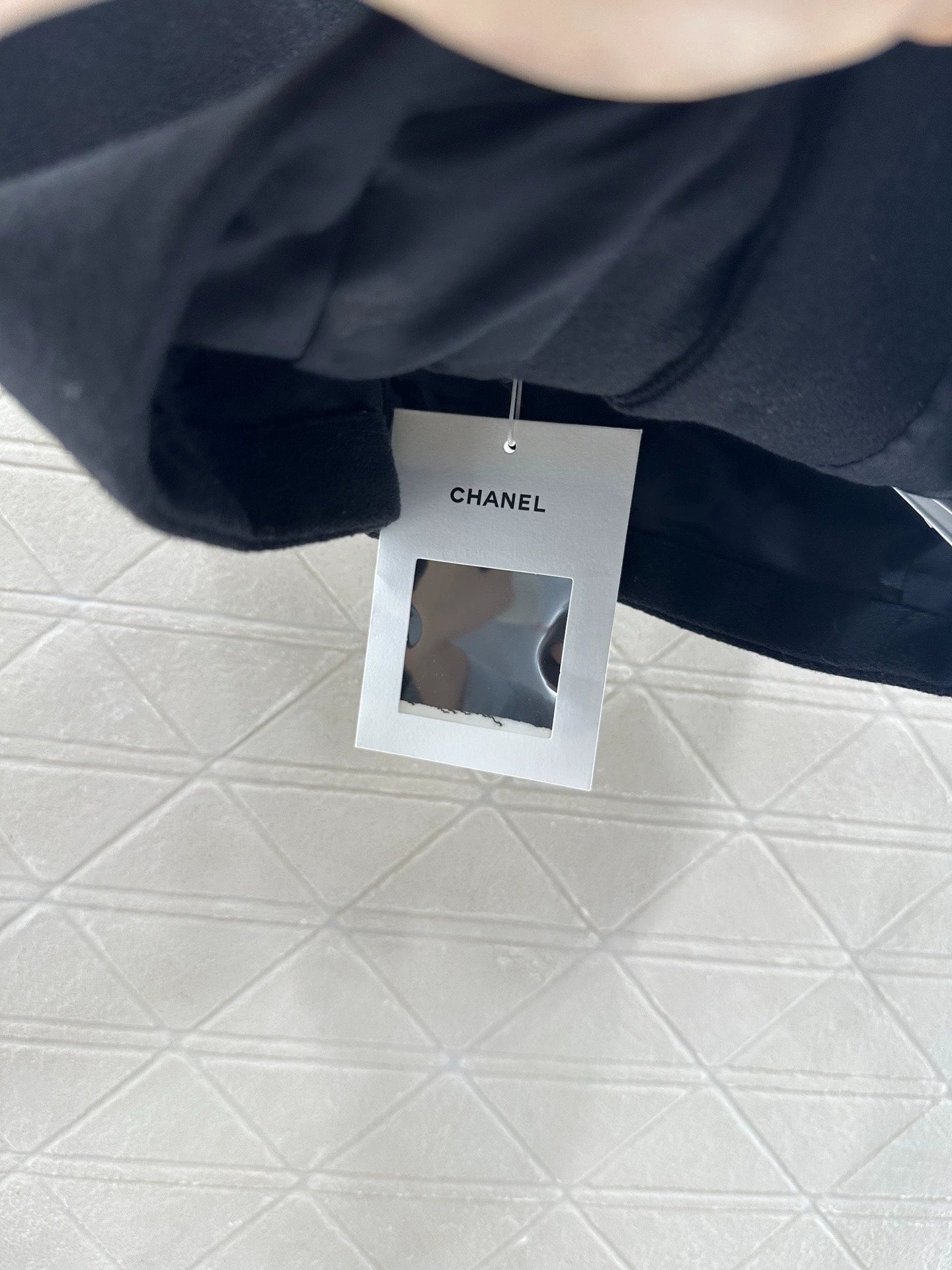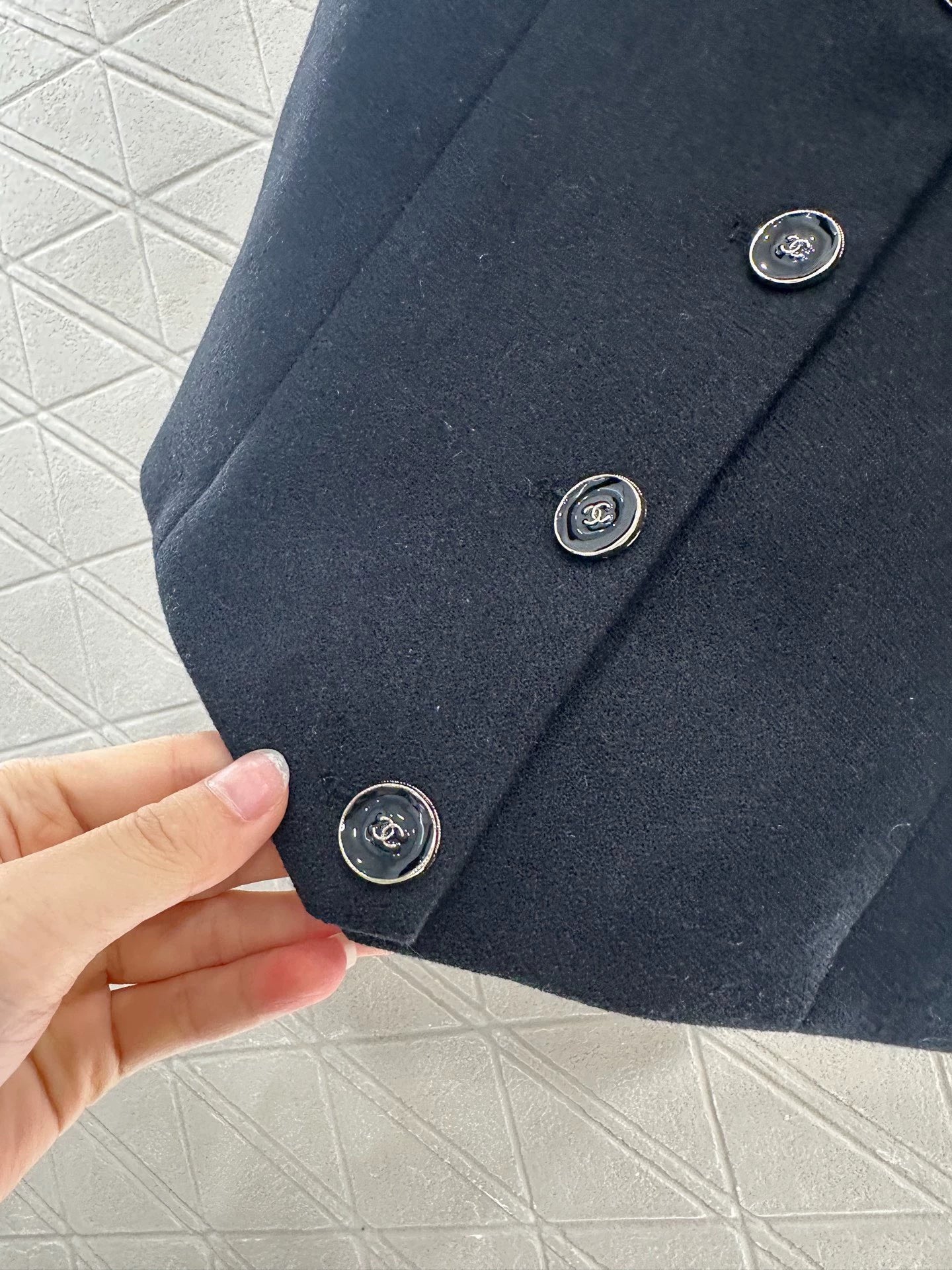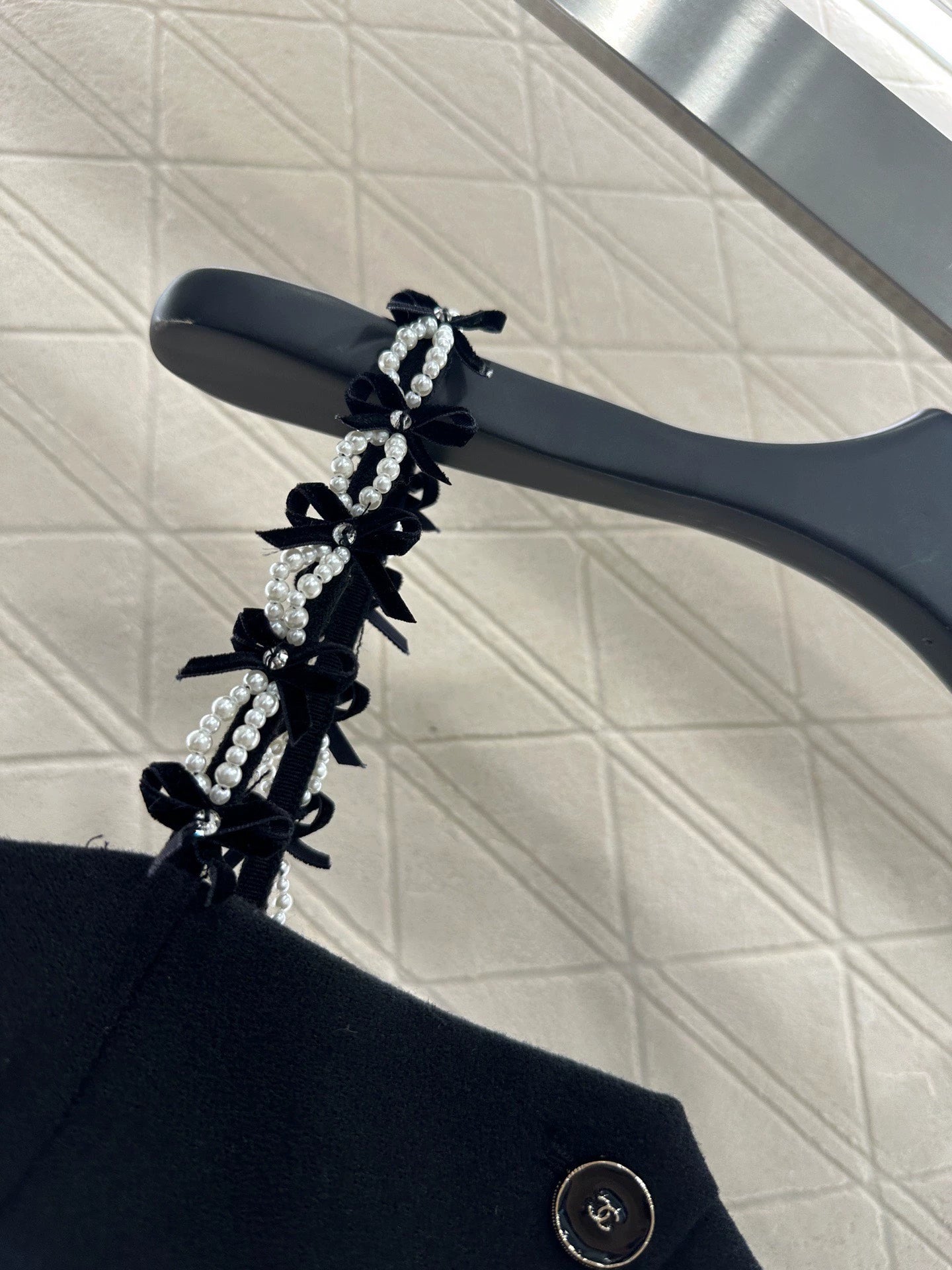 Custom YB imported 100% imitation wool material for a premium feel and stylish outfit. The all-black, stylish, and timeless look exudes a vintage feel. The camisole is embellished with lustrous pearls and a bow, creating a sexy, alluring, and luxurious look. The double C logo on the chest adds a touch of class. The top is elegant and relaxed, creating a vacation vibe. Available in a ceiling version with a silk jacquard lining. Custom fabrics and accessories available. Check out the high-end version.