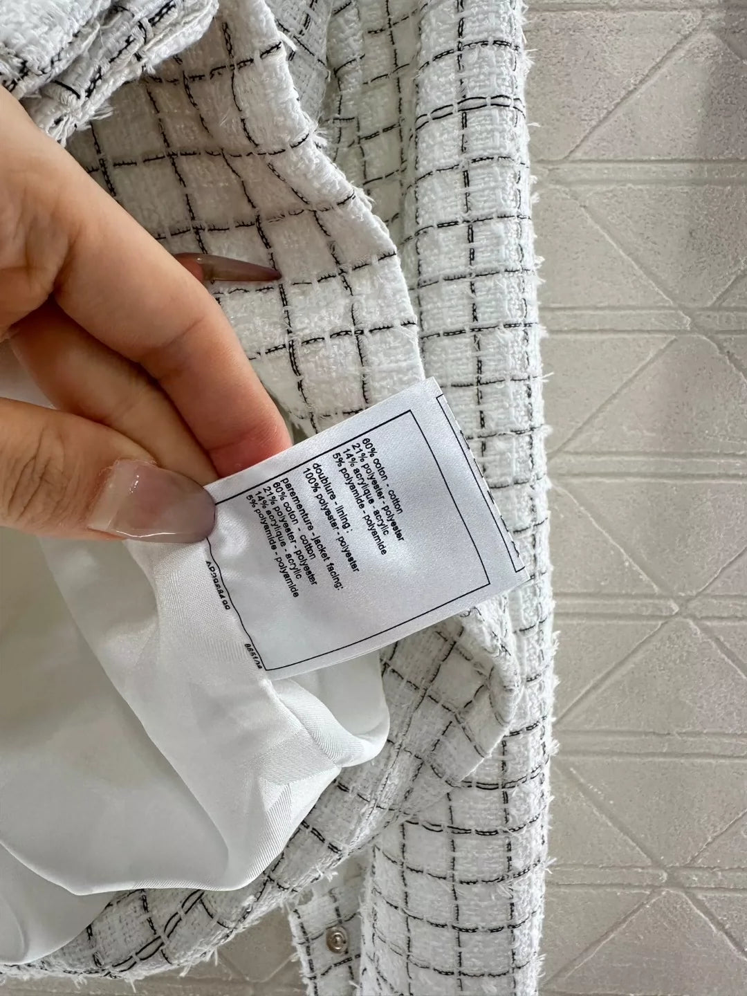 Imported worsted wool tweed material, texture is obvious, texture is superior, tweed fabric shaping a small fragrant style model, lapel collar, long-sleeved silhouette dress jacket, Oversized version is more inclusive, the overall white background, black line plaid is elegant and not boring, ready-to-wear weaving elements are luxurious and charming, together with flap symmetrical pockets, showing the high-class celebrity style, conventional tailoring temperament is stylish, the first choice for fall and winter seasonal wear.