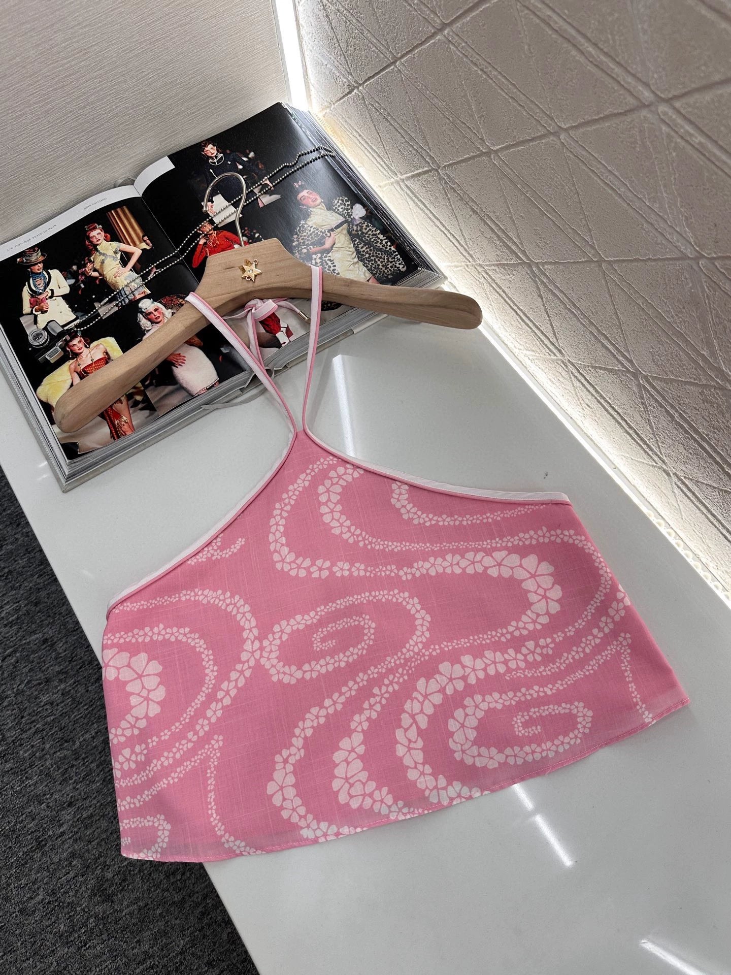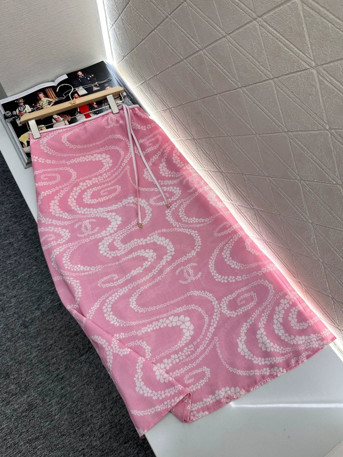 Custom-made YB imported twill fabric, lightweight and breathable, soft and skin-friendly, featuring a delicate, slightly sheer texture. The halter neck tank top is paired with a straight-leg midi skirt with side ties at the waist. The entire piece is adorned with an all-over print of irregularly arranged camellia patterns, interspersed with double C logos, highlighting the brand's elegance. The intricate visual design creates a romantic and elegant style, brimming with personality and creativity. The short top and long skirt flatter the figure and enhance its beauty. The skin exposure level maximizes the vacation vibe, making it the perfect choice for summer. Custom-made fabric and lining. Choose the high-quality version.