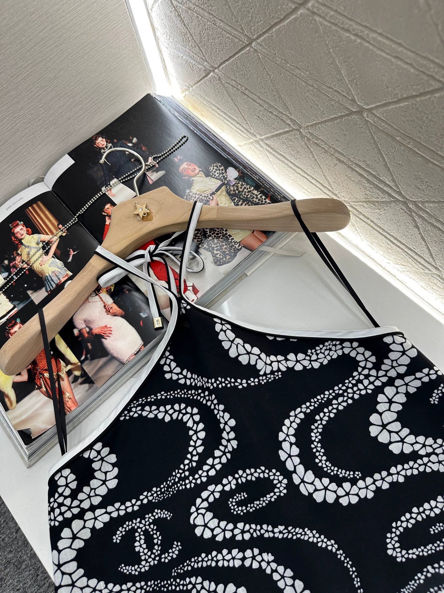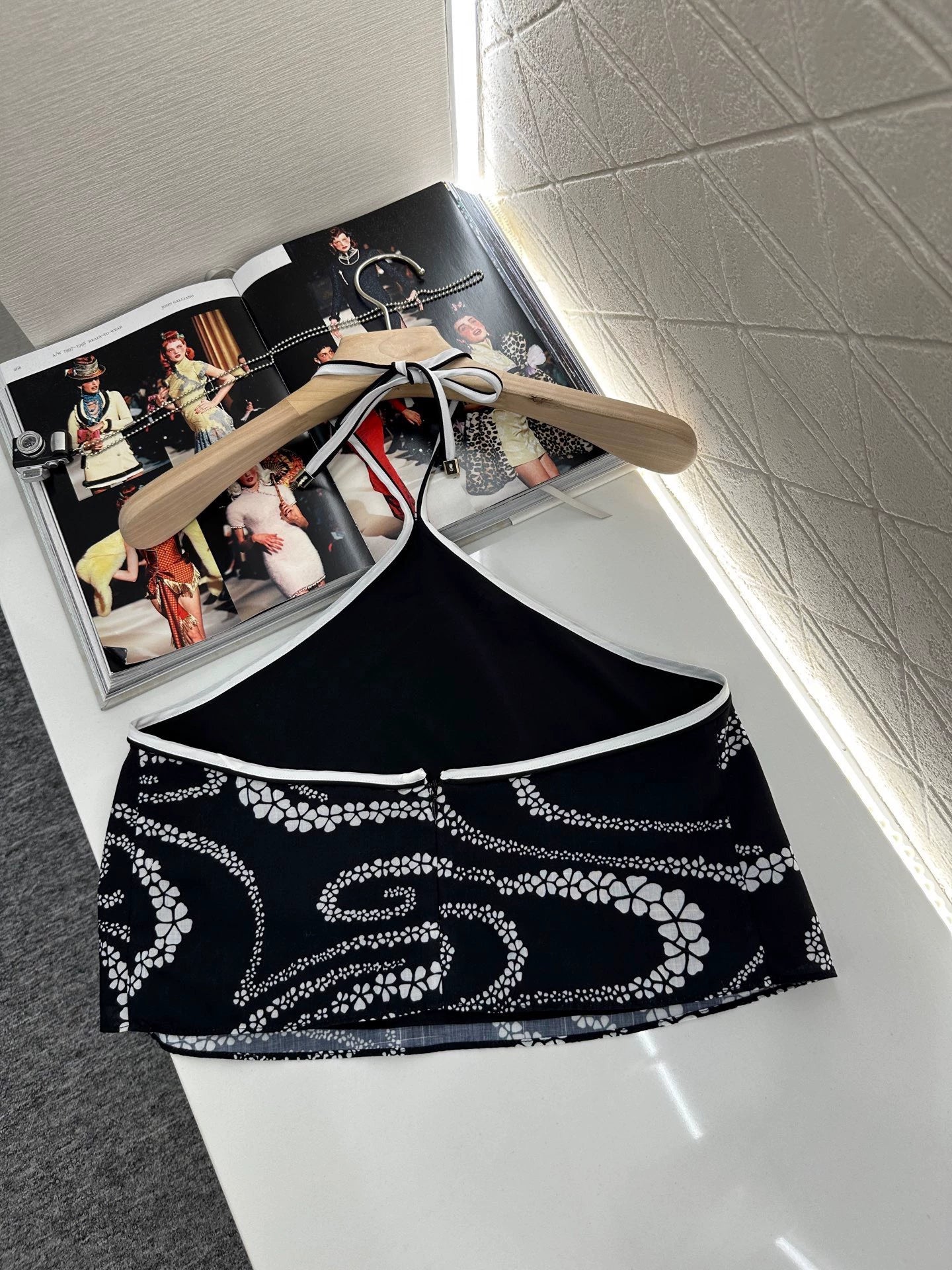 Customized YB imported twill material, refreshing and breathable, soft and skin-friendly, showing a light and slightly transparent texture. Halter vest with waist-side tie straight mid-length skirt set. Irregular camellia pattern printed all over the body, interspersed with double C logo, highlighting the brand style. Complex visual effects, creating a romantic and aesthetic style, full of personality and creativity. Short top and long bottom, modifying the body shape and beautifying the proportion. The degree of skin exposure makes the holiday feel full. The first choice for refreshing summer. Customized surface and accessories. Look for the version. High version