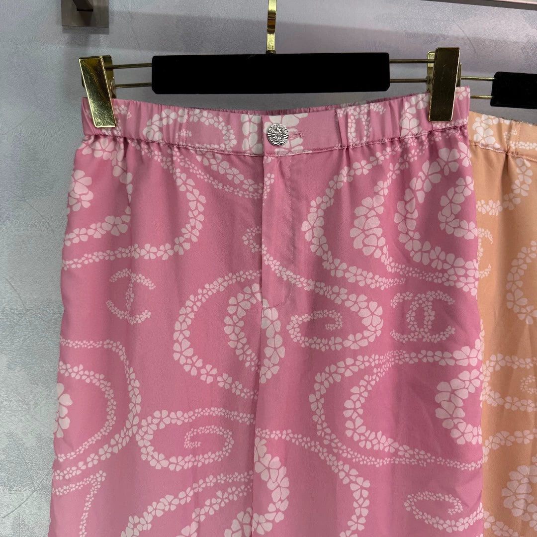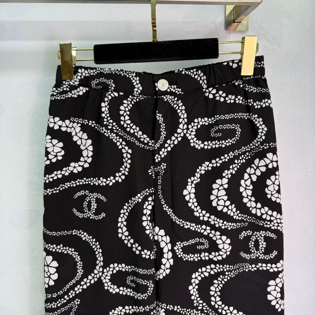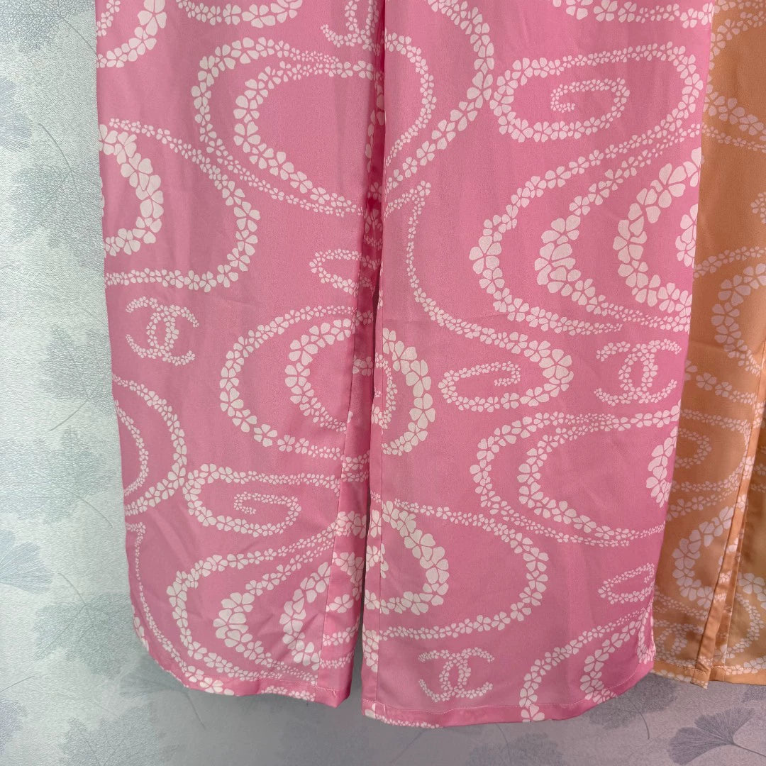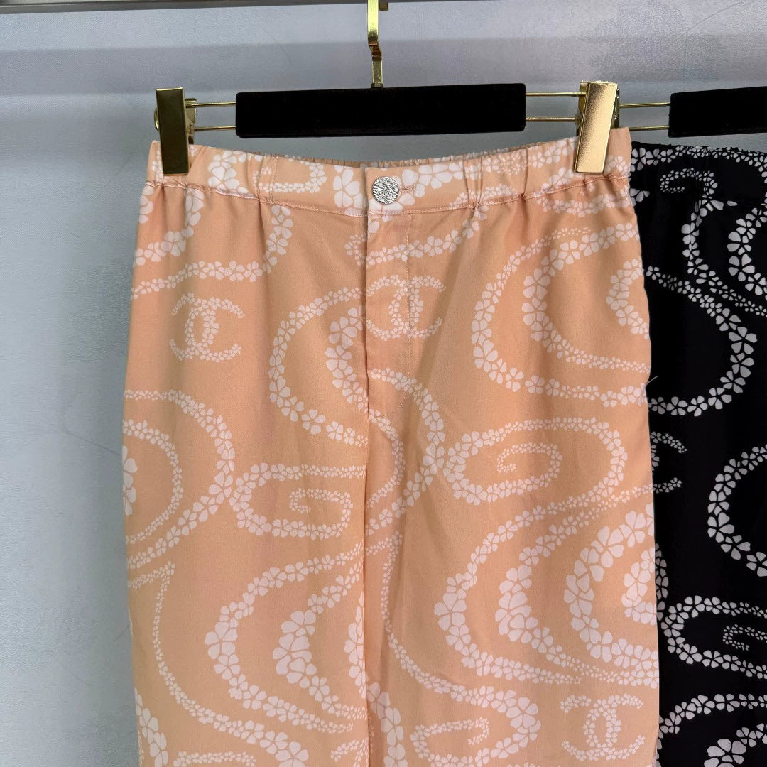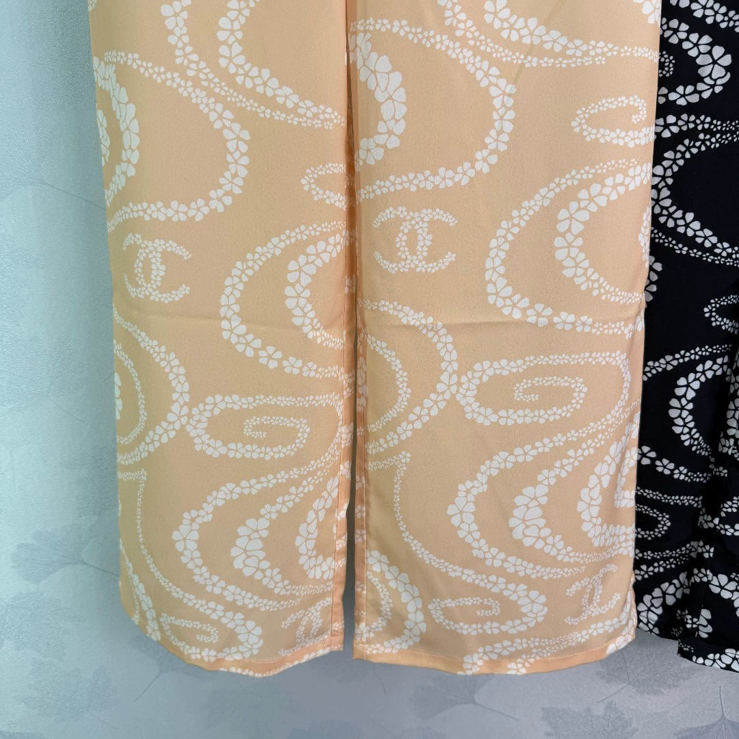 Customized YB imported twill thick material Refreshing and breathable Soft and skin-friendly Presenting a light and slightly transparent texture Stretch button wide-leg straight-leg pants cropped Printed with irregular staggered camellia pattern throughout Interspersed double C logo Highlighting the brand's style Swirling and complex visual effect Creating a romantic and aesthetic style Full of personality and creativity Trimming the body to beautify the proportion of the brand's high-level design sense pulling full of the first choice for summer refreshing Customized fabric and auxiliary material Recognized edition