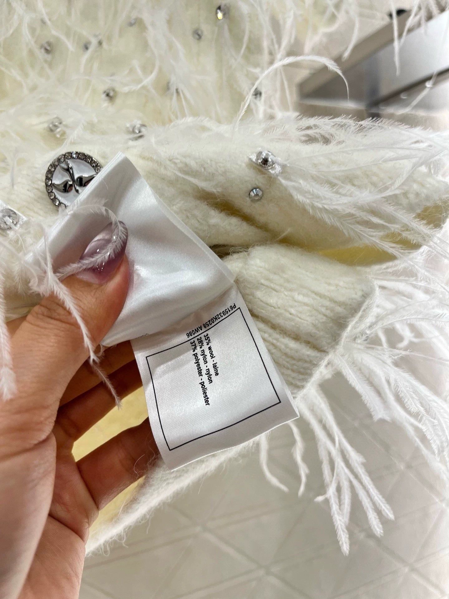 Crafted from cashmere yarn, it's soft and stretchy, with a round neck and a knitted cardigan cut to a high quality finish, with rhinestone accents throughout and cascading feathers that are subtle and rich, adding a touch of glamour to an easy-to-wear look, a slim fit that flatters the figure, and simple embellishments for a playful girly style.