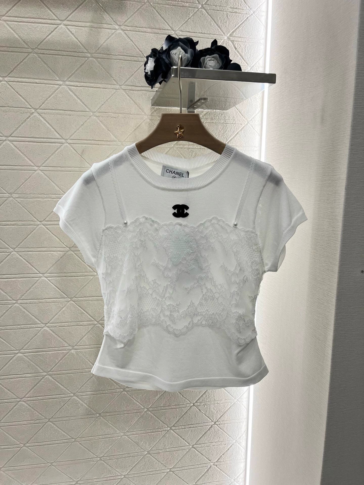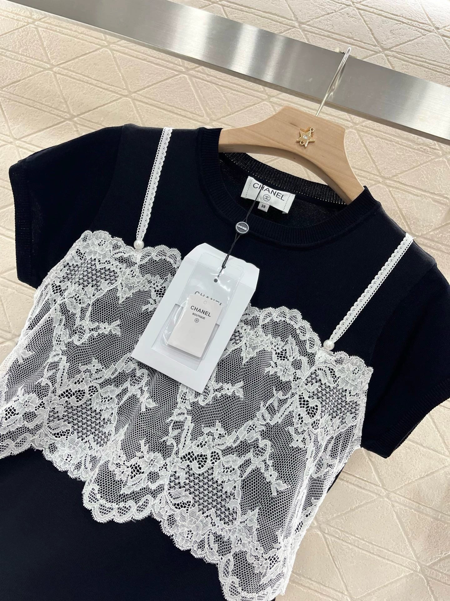 Comfortable, soft, stretchy, round-necked, lined, ➕ lace, flat, spaghetti straps, fake two-piece design, with the inside peeking out and clashing with the outside, in a layered design.