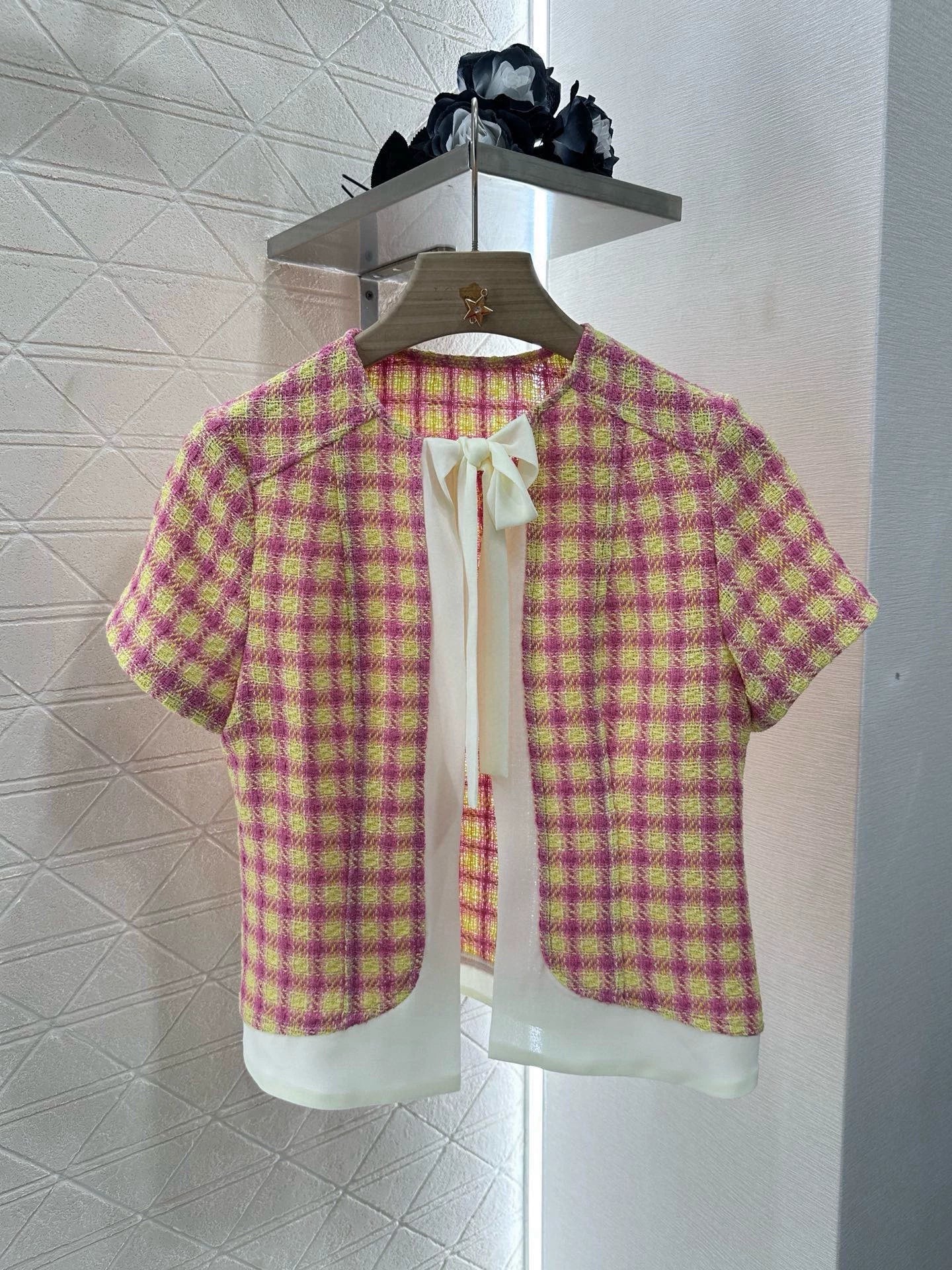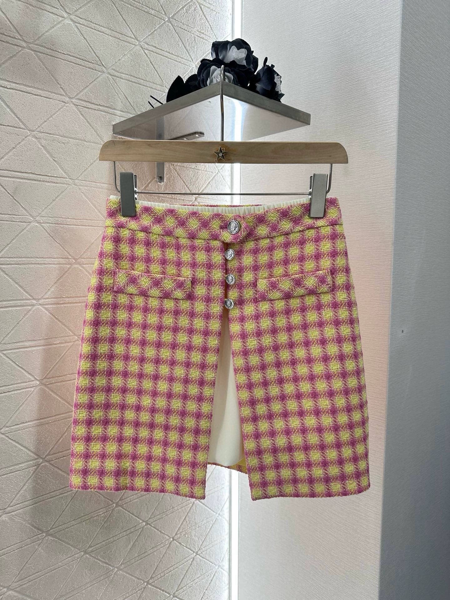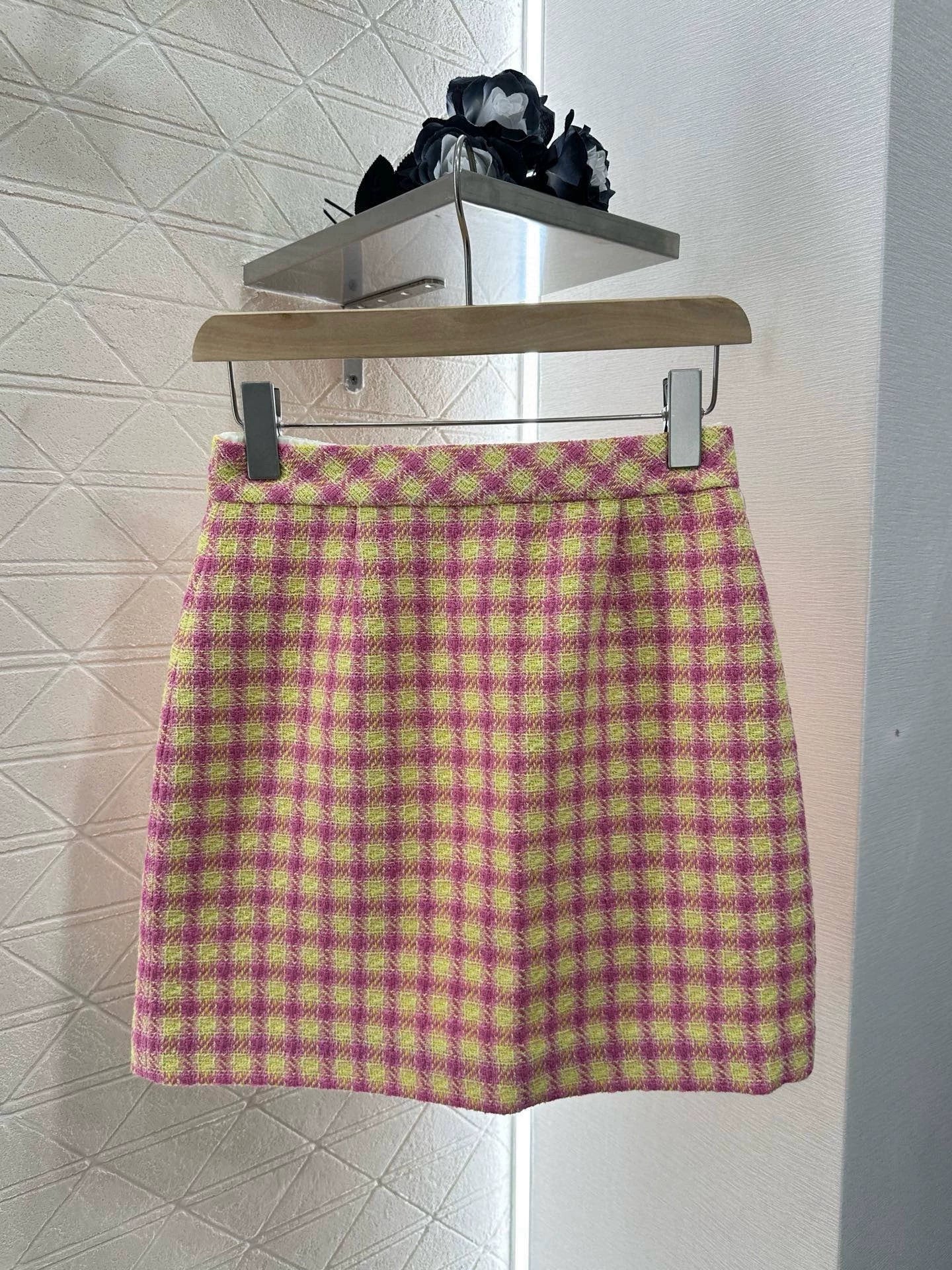Imported wool tweed material round neck, short-sleeved blouse and half skirt three-piece set shoulder design fit the human body, more show the slender and straight posture The use of red and yellow check pattern to add a sense of youthful sophistication with ribbons ➕ with the material of the front placket with the same material, the atmosphere of a dame immediately with the series of half-skirts, the outer skirt details echoed the design of the front side of the two-piece slit design with the detachable petticoat cover the bird buttons perfect interpretation of the sense of elegance of gold The set of noble and texture