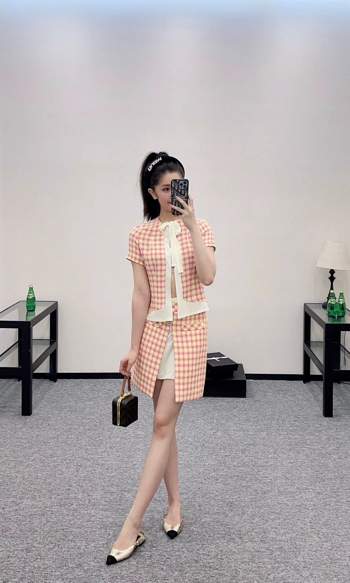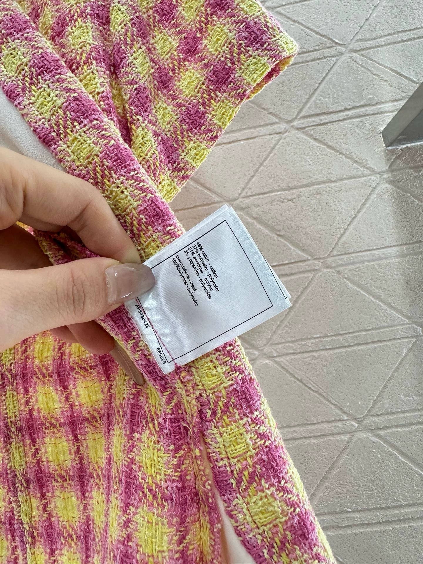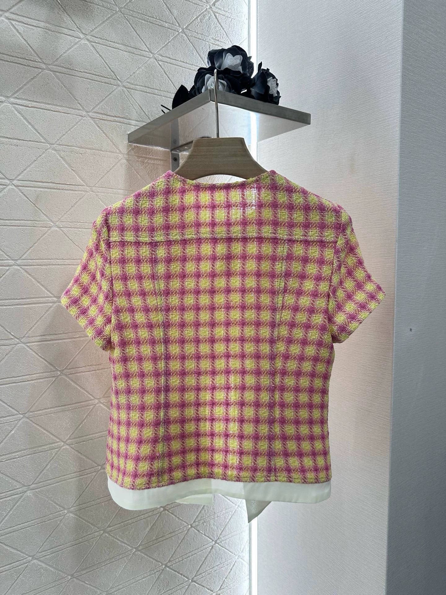 Imported wool tweed material round neck, short-sleeved blouse and half skirt three-piece set shoulder design fit the human body, more show the slender and straight posture The use of red and yellow check pattern to add a sense of youthful sophistication with ribbons ➕ with the material of the front placket with the same material, the atmosphere of a dame immediately with the series of half-skirts, the outer skirt details echoed the design of the front side of the two-piece slit design with the detachable petticoat cover the bird buttons perfect interpretation of the sense of elegance of gold The set of noble and texture