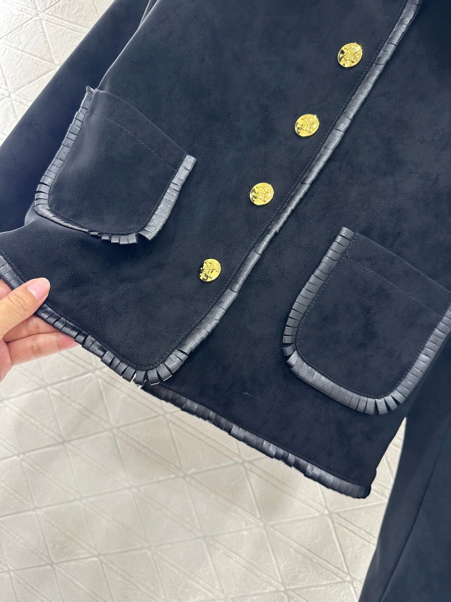 Customized YB imported genuine leather with a distressed finish for a vintage look. The leather-trimmed dress jacket features a collar, lapels, and pockets with a sheared edge, creating a contrasting fabric and color palette for a rich visual effect. Gold-tone buttons accentuate the look, creating a sophisticated, ladylike look. Paired with a matching skirt, the look seamlessly complements the look, perfectly embodying the elegant, sophisticated look of a wealthy woman. Perfect for formal occasions. ⚠️ Lettering jacquard lining. Custom fabrics and trims. Check for the latest version.