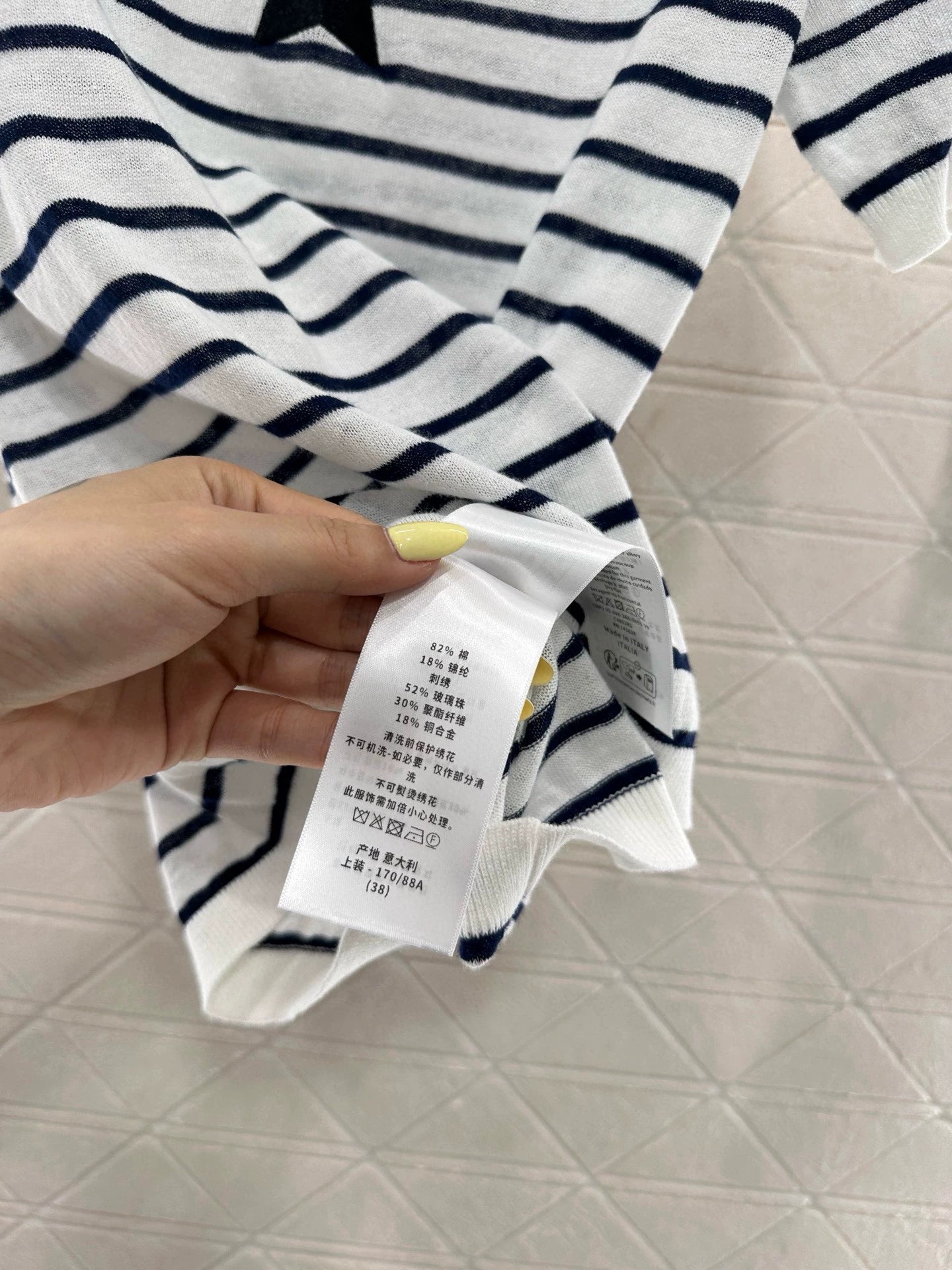 Cotton and wool yarn weave Breathable and comfortable Full of texture Regular short-sleeved cut On the top of the body to present a casual and lazy wear style Black and white stripes on the body evenly interlaced Stretch elastic threaded edging Increase the sense of wearing beauty and high casual sense Wear alone and wear underneath the fashionable Chest embellished with three-dimensional five-pointed star pattern and the letter logo Wear high-grade ageing