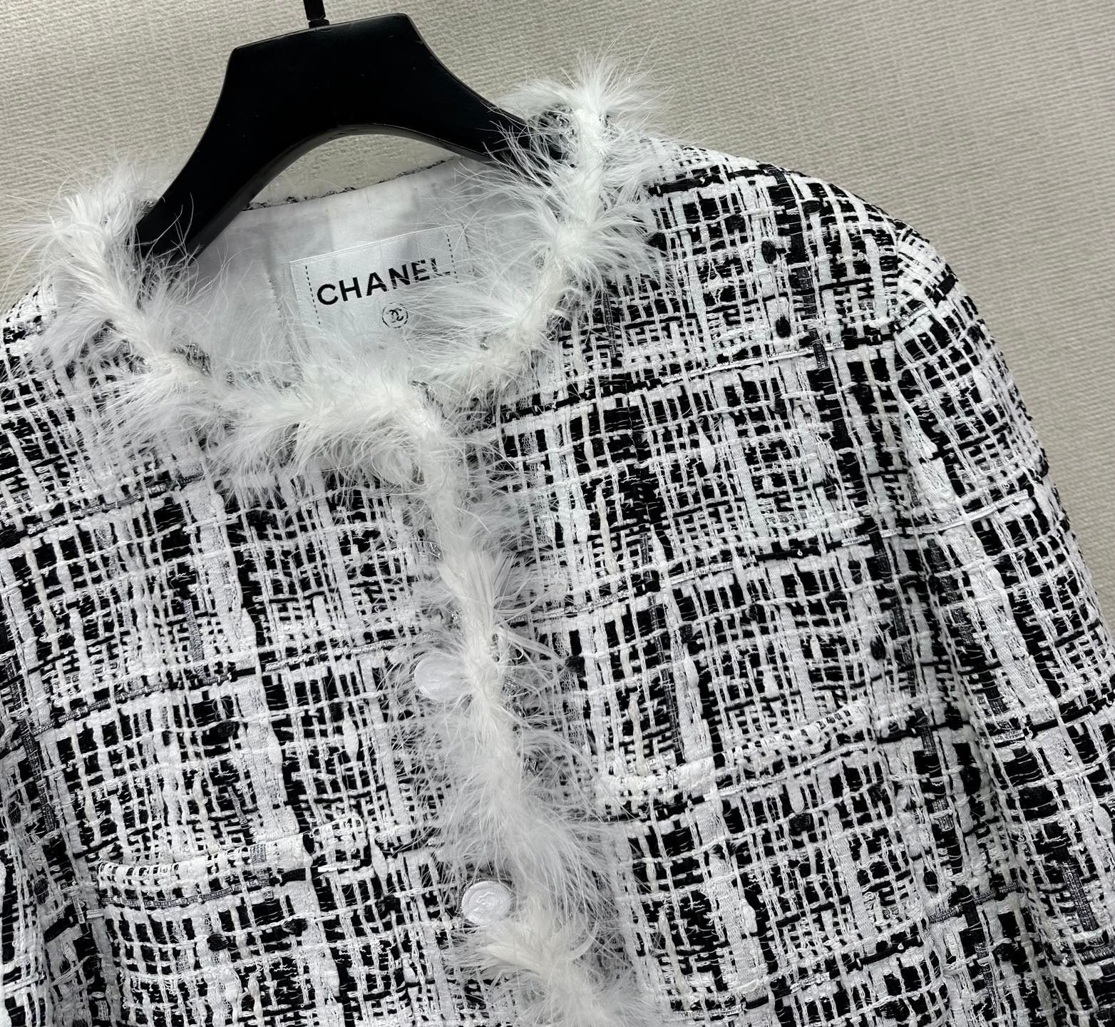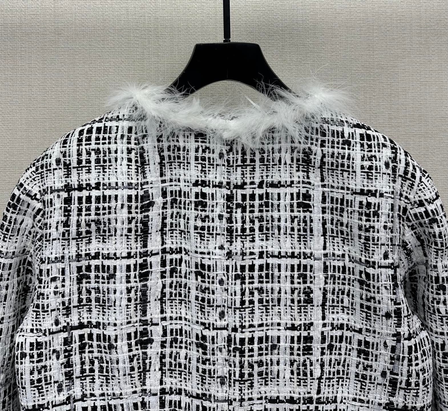 Crafted from a black-and-white tweed in a structured check pattern, this jacket balances timeless tailoring with modern accents. The neckline, cuffs, and hem are adorned with soft feather-textured trims, adding dimension and a sense of playfulness to the otherwise structured silhouette. The cropped cut flatters the waistline, making it a versatile piece to pair with high-rise trousers or skirts for a polished, Parisian-inspired ensemble.