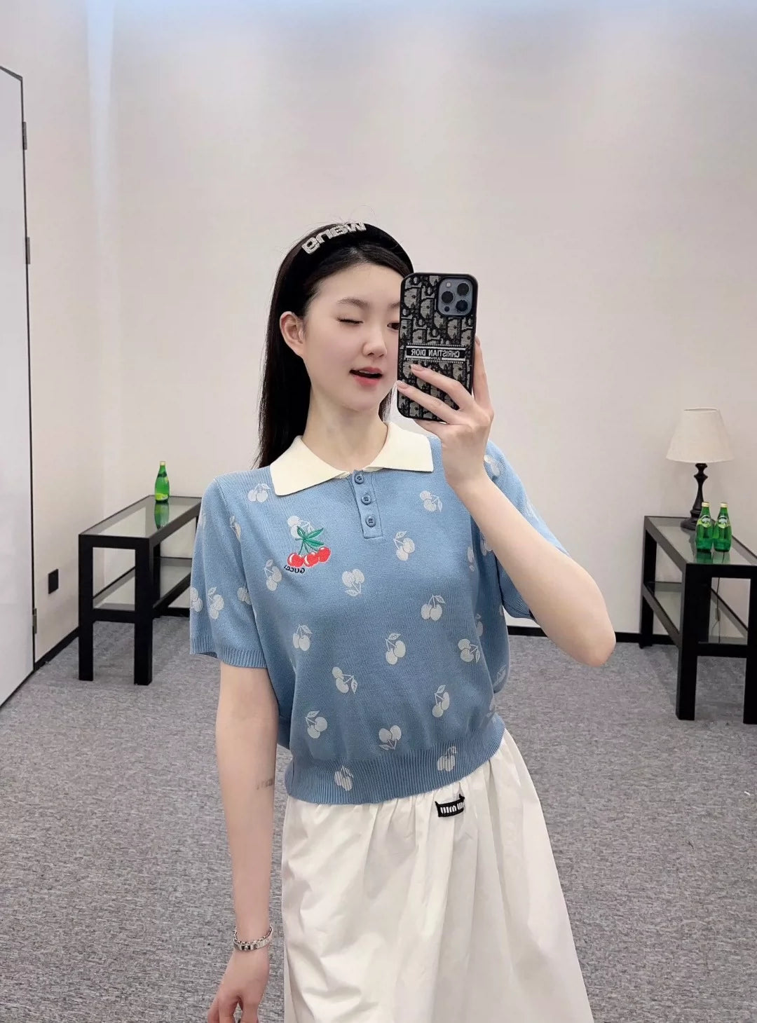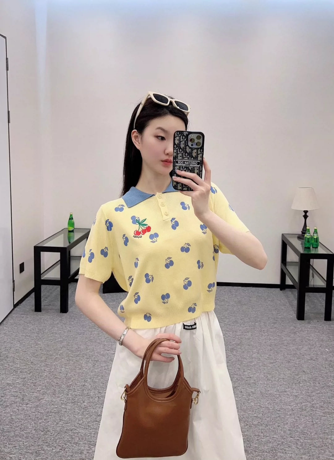 Wool yarn knitting fine soft stretch stylish exquisite lapel short-sleeved version of the body to increase the cherry pattern design with the neckline echoed with the body of the different bright color collision to make the level more rich hem threaded edge details full of retro college style strong playful ageing whitening daily travel or easy to party easy to manage