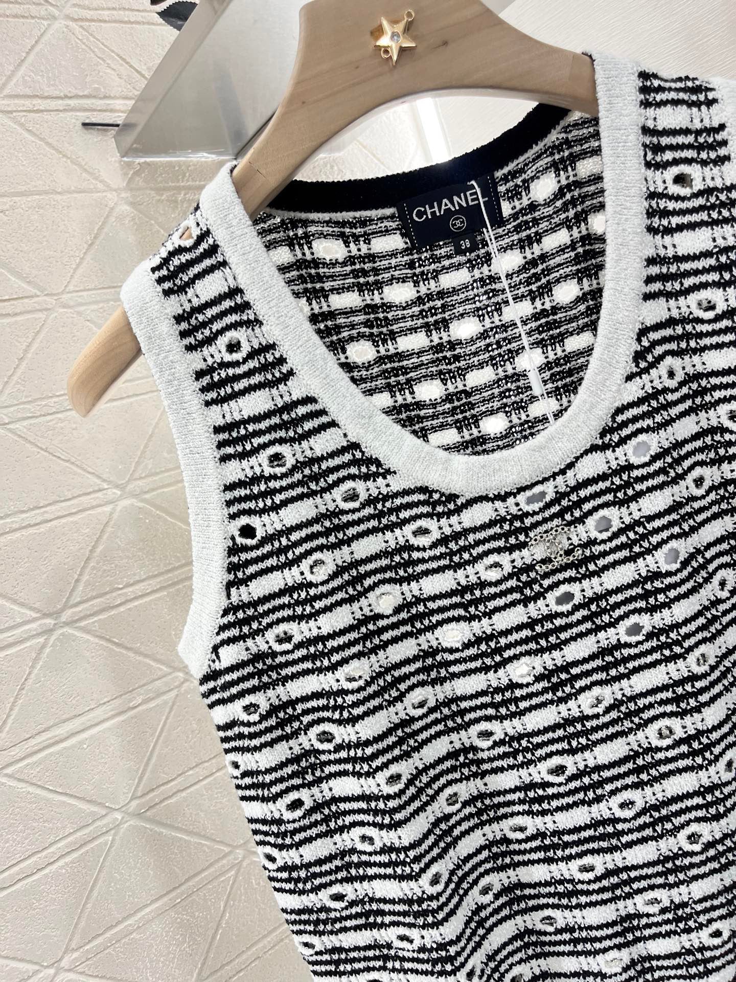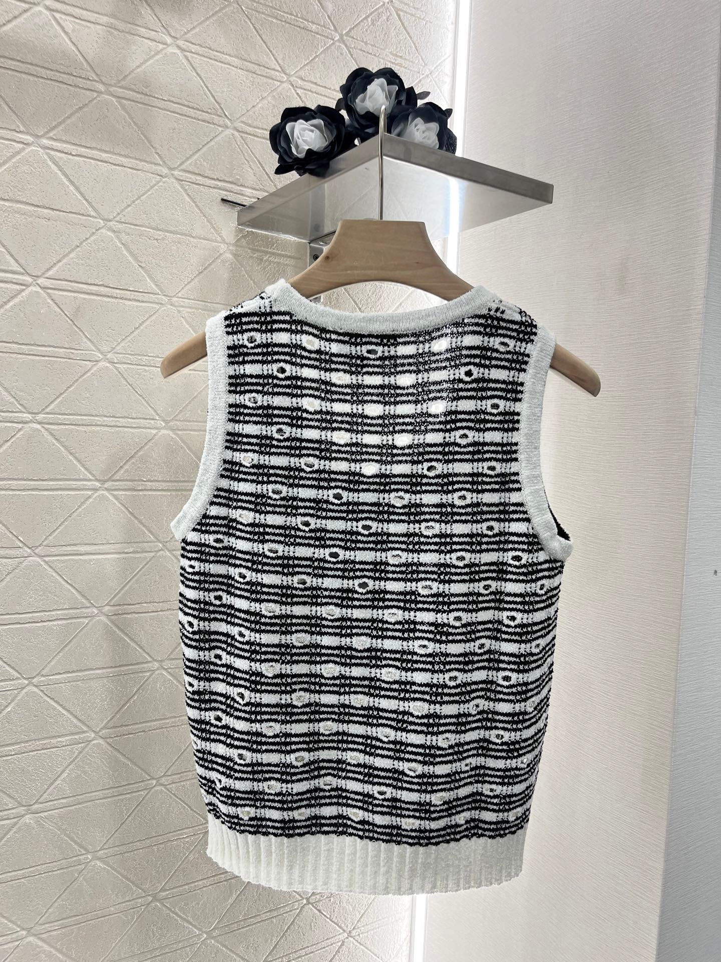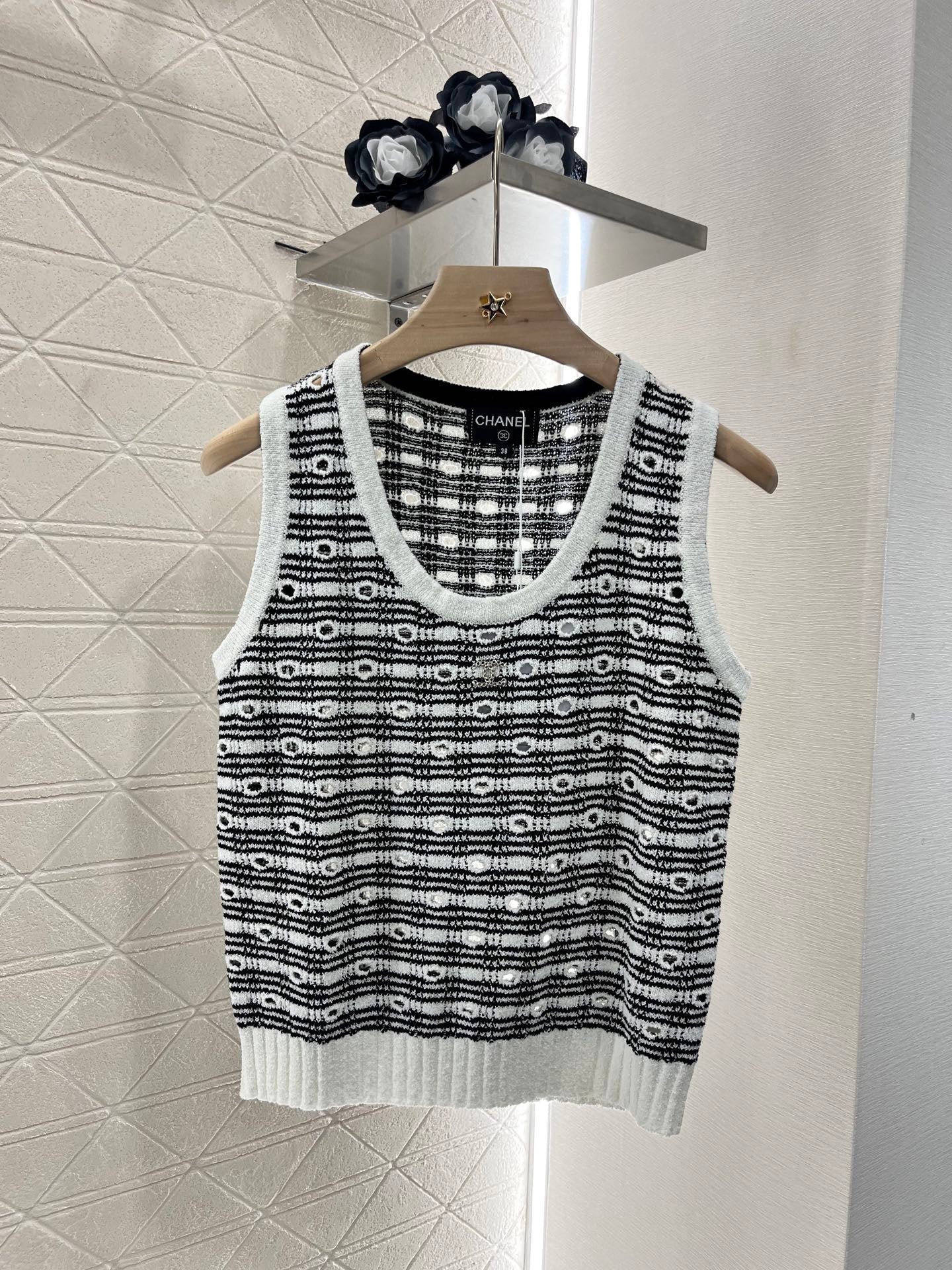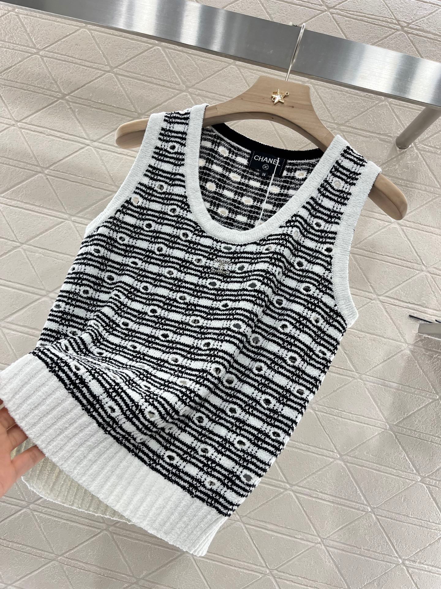 Cotton and wool yarn weaving, soft and skin friendly, comfortable and stylish knitted vest with a tailored neckline that exposes the skin and beautifies the head and shoulders. The proportion of the head and shoulders is more slimming. The solid color edging and large body plaid and hollow out are different from each other. The three-dimensional rhinestone double C logo embroidery pattern forms a layered retro style with a strong slimming effect, highlighting the fashionable and stylish figure. Customized materials and accessories for daily vacation