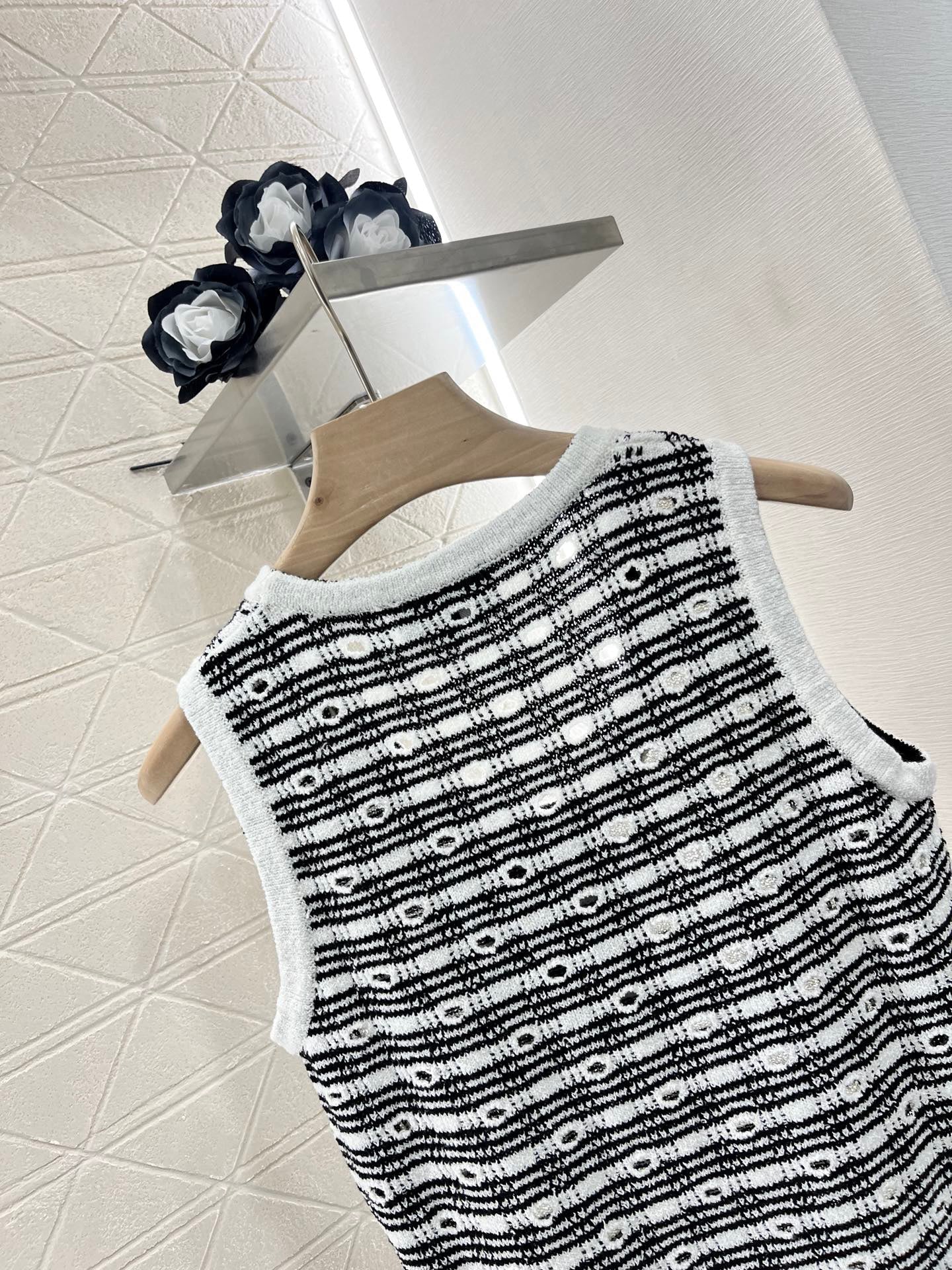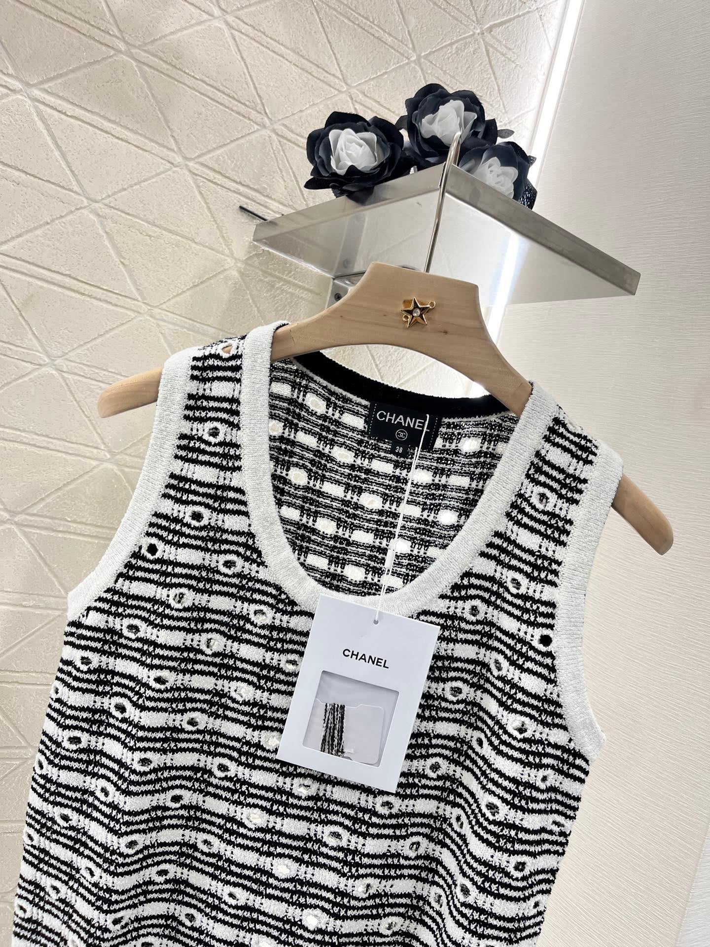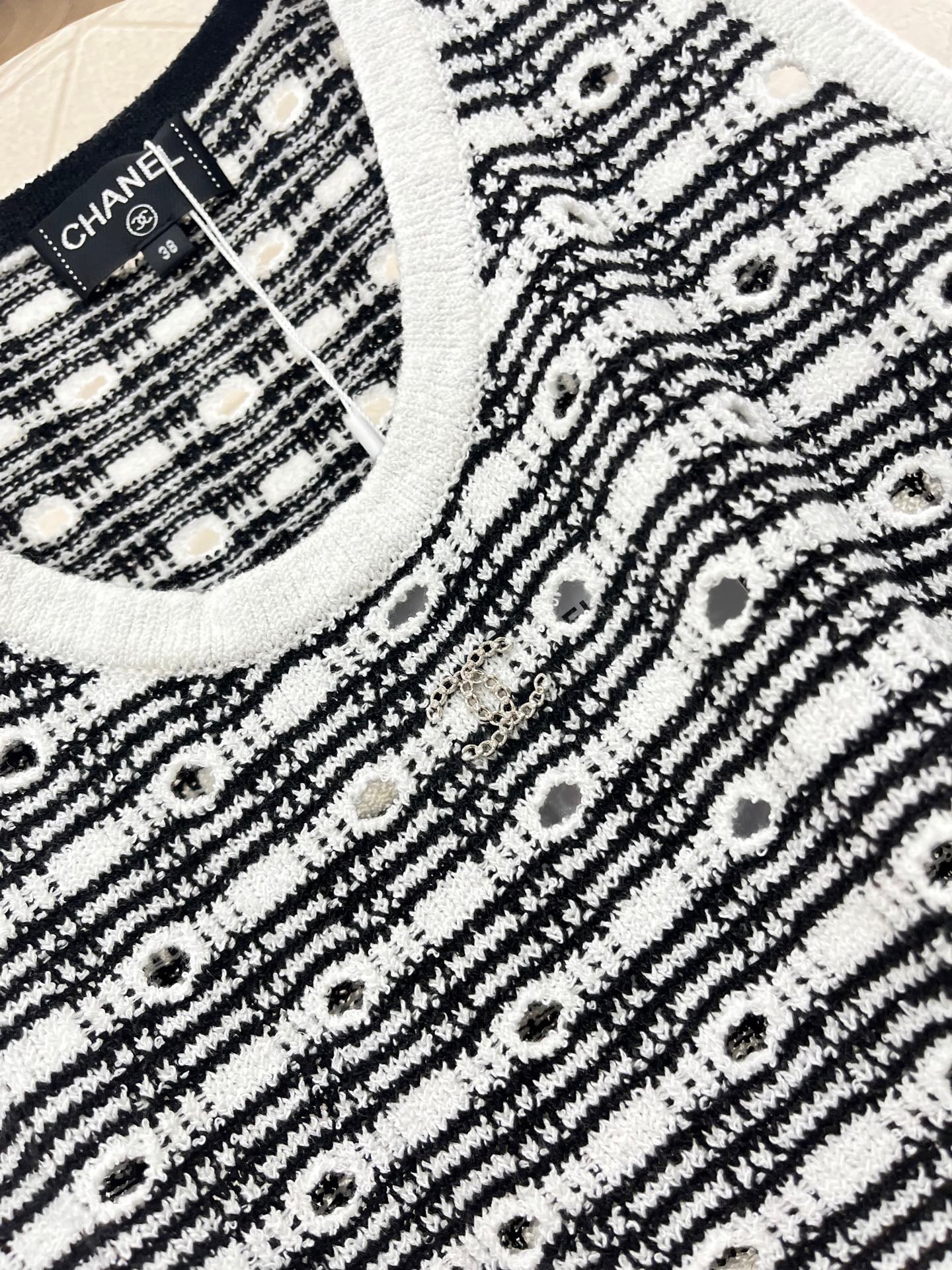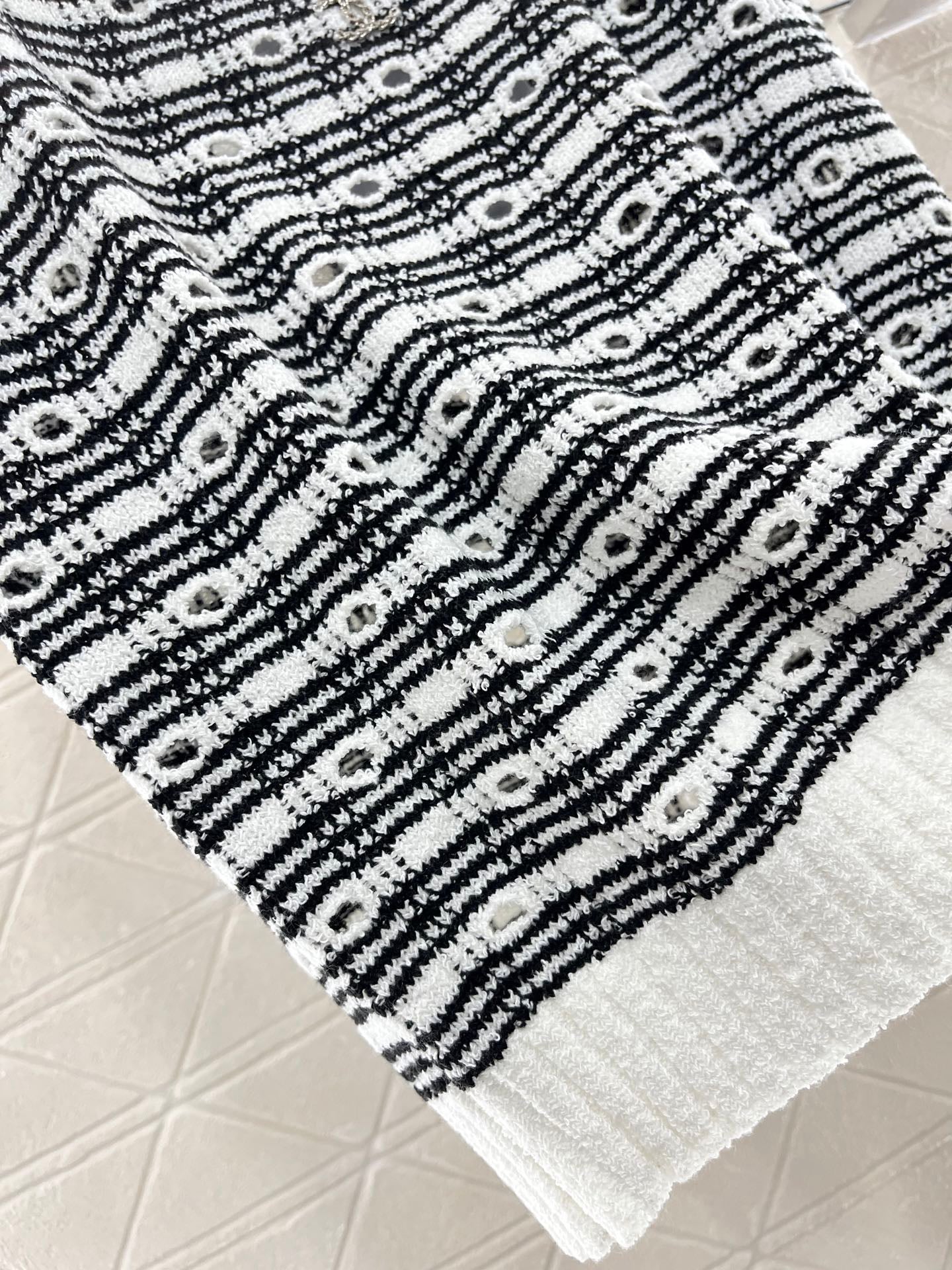 Cotton and wool yarn weaving, soft and skin friendly, comfortable and stylish knitted vest with a tailored neckline that exposes the skin and beautifies the head and shoulders. The proportion of the head and shoulders is more slimming. The solid color edging and large body plaid and hollow out are different from each other. The three-dimensional rhinestone double C logo embroidery pattern forms a layered retro style with a strong slimming effect, highlighting the fashionable and stylish figure. Customized materials and accessories for daily vacation