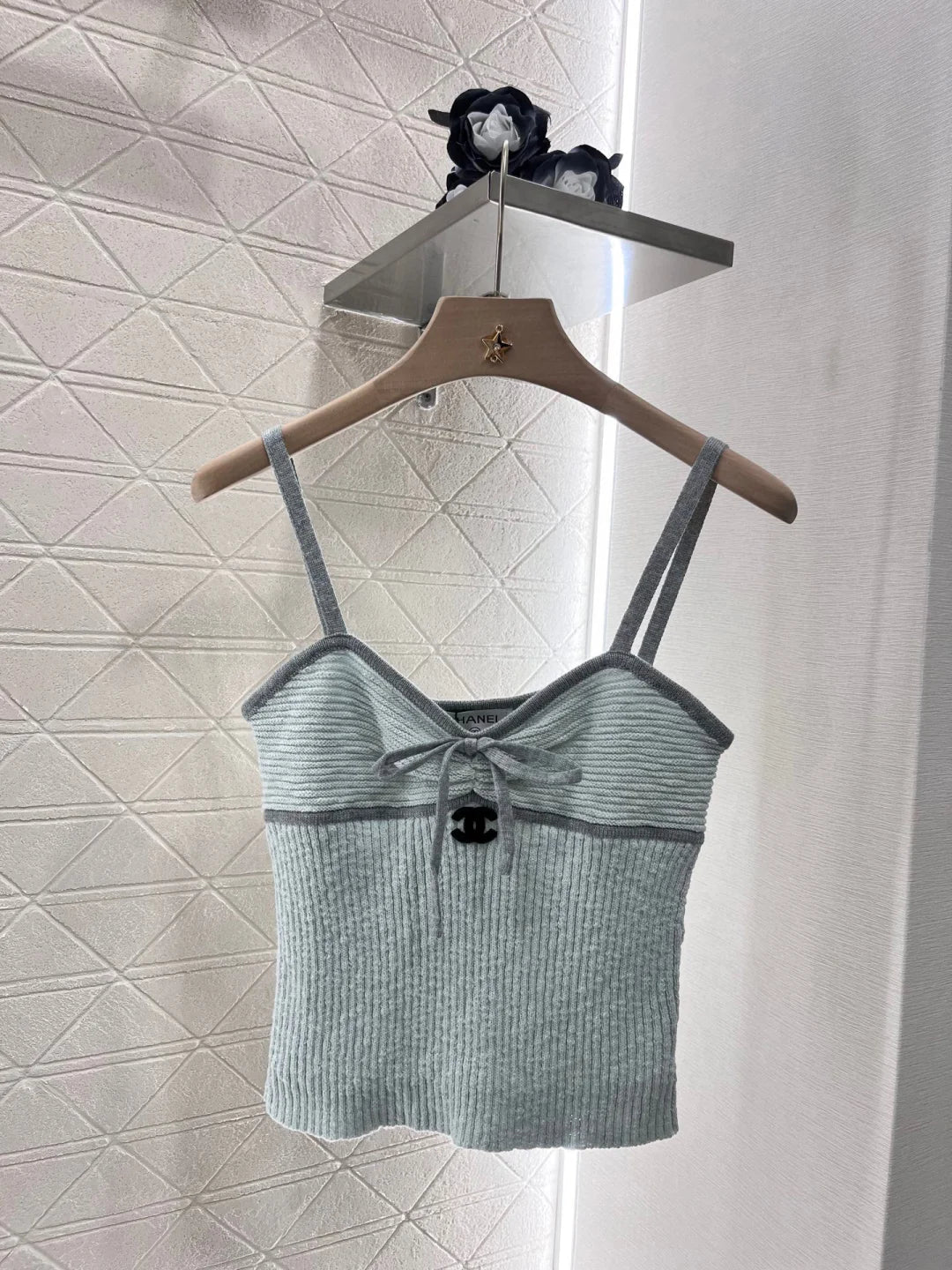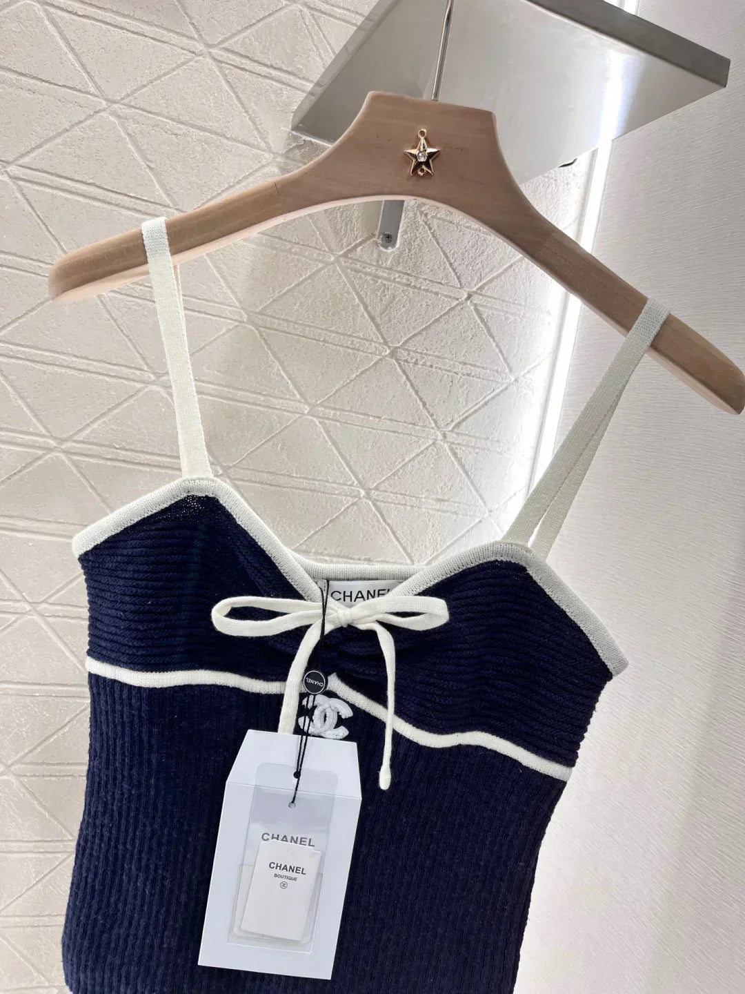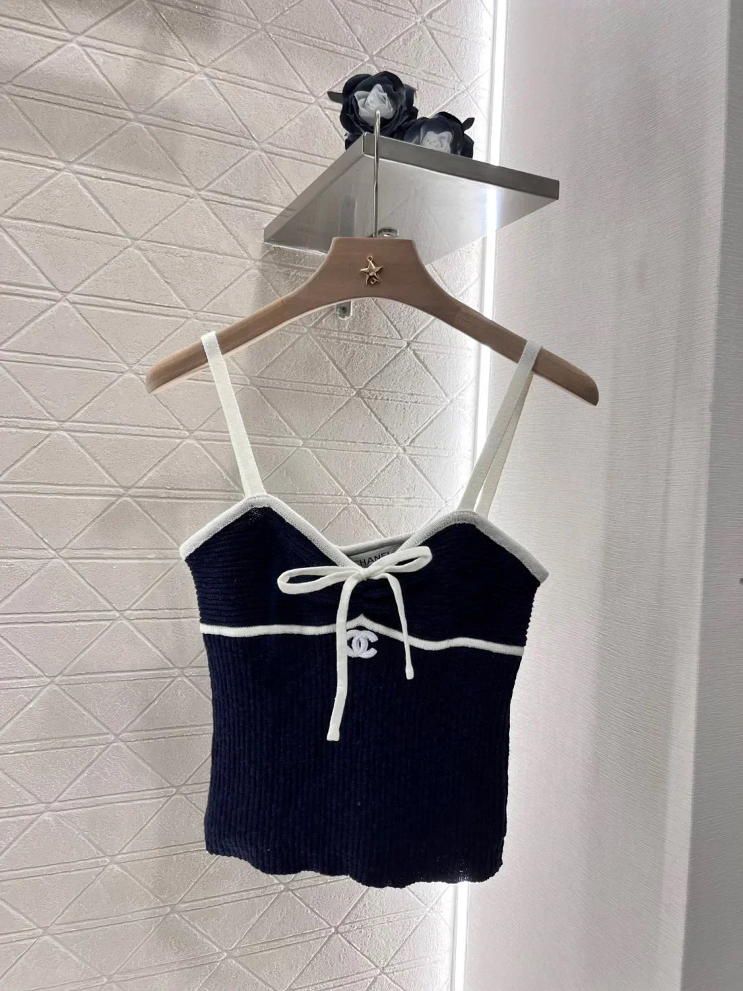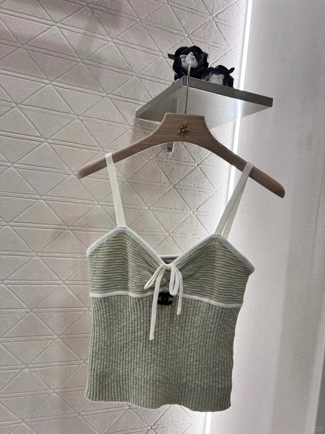 Wool yarn weaving, skin-friendly and comfortable, stretchy and easy to wear. Camisole style. Slender suspenders modify the beautiful lines of the shoulders. A lace-up bow and double C logo are placed in the center of the chest. It is low-key and exquisite. The outline line and the body form a color collision. It is matched with pitted texture to add layering to the look. Sexy and charming.