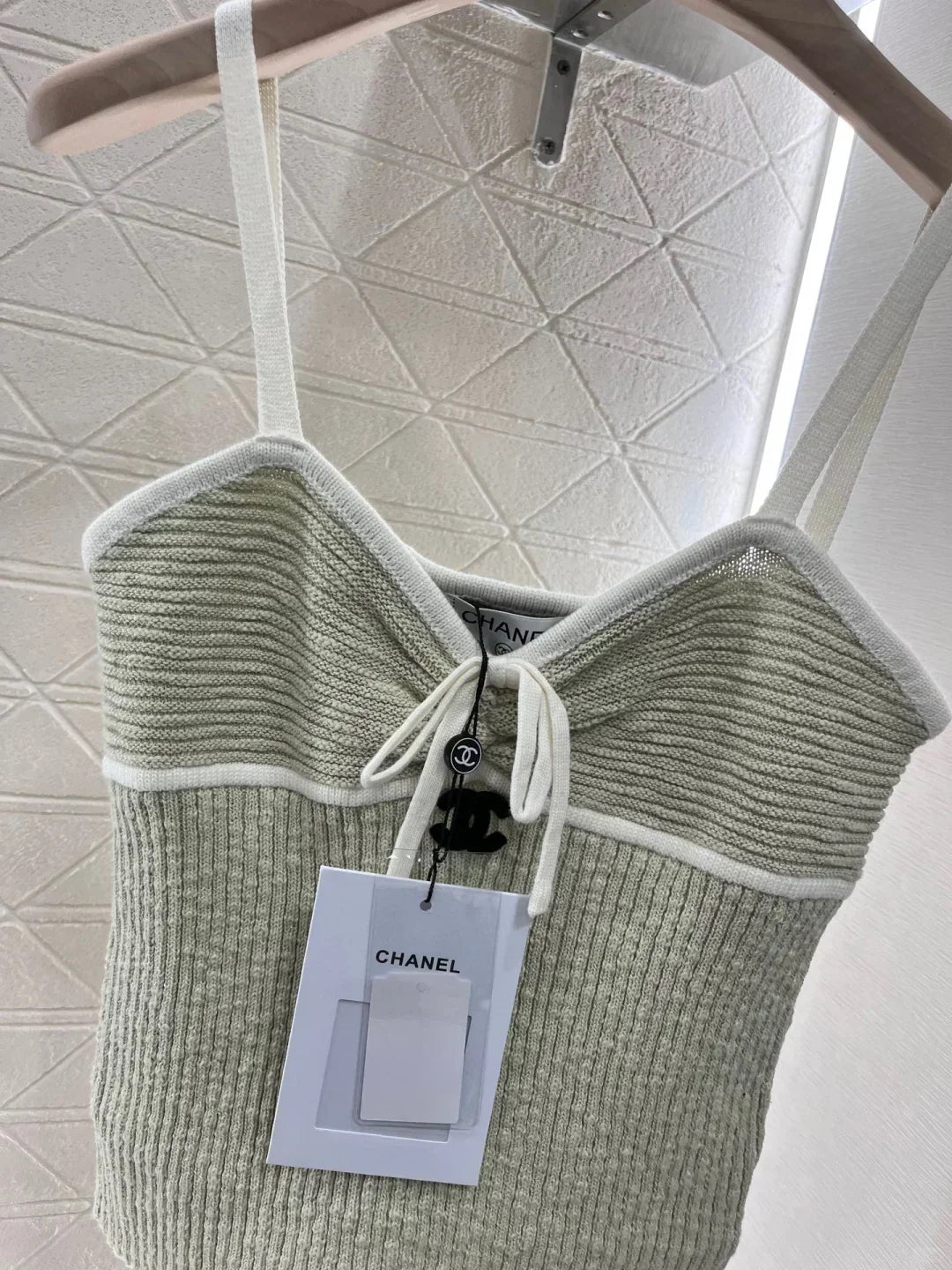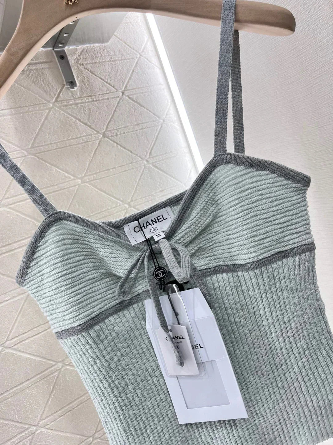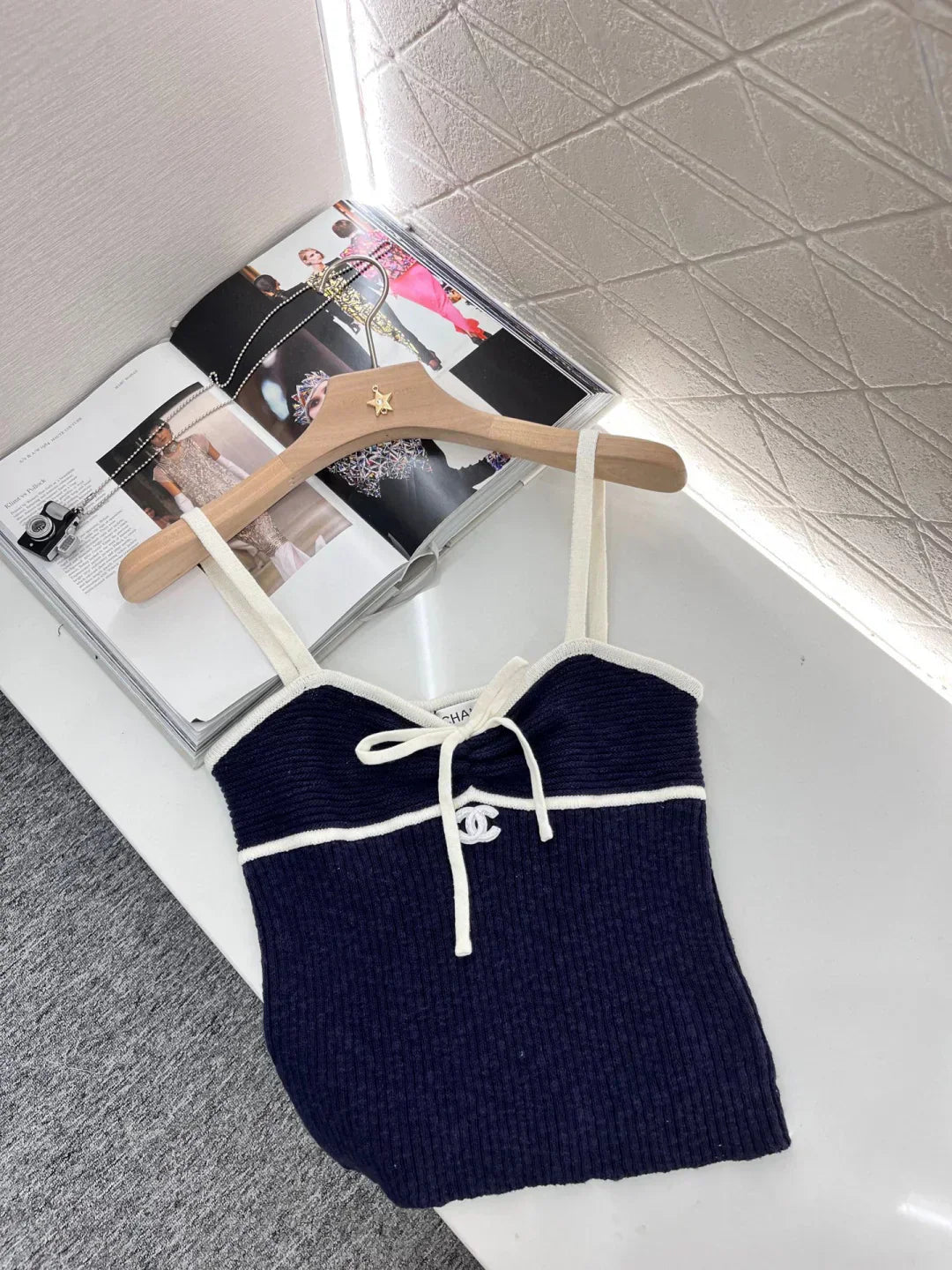 Wool yarn weaving, skin-friendly and comfortable, stretchy and easy to wear. Camisole style. Slender suspenders modify the beautiful lines of the shoulders. A lace-up bow and double C logo are placed in the center of the chest. It is low-key and exquisite. The outline line and the body form a color collision. It is matched with pitted texture to add layering to the look. Sexy and charming.