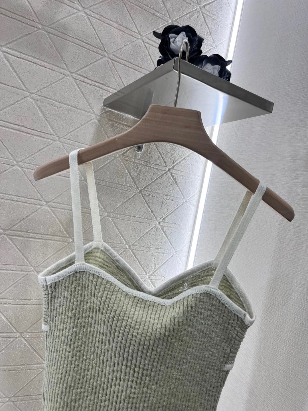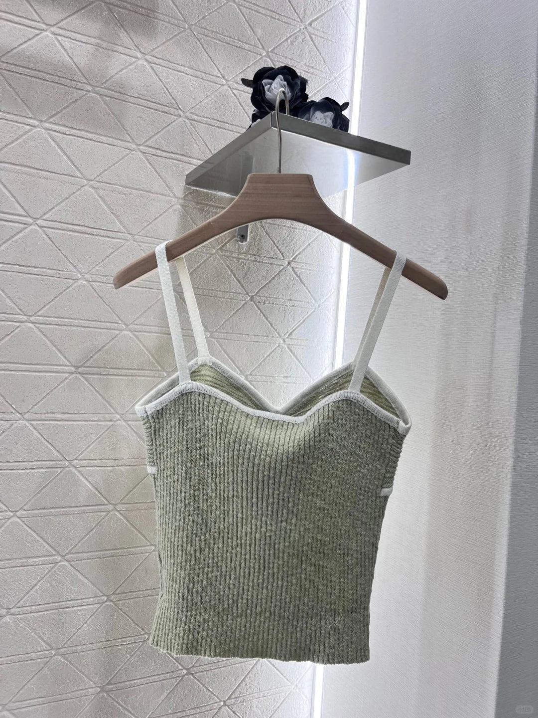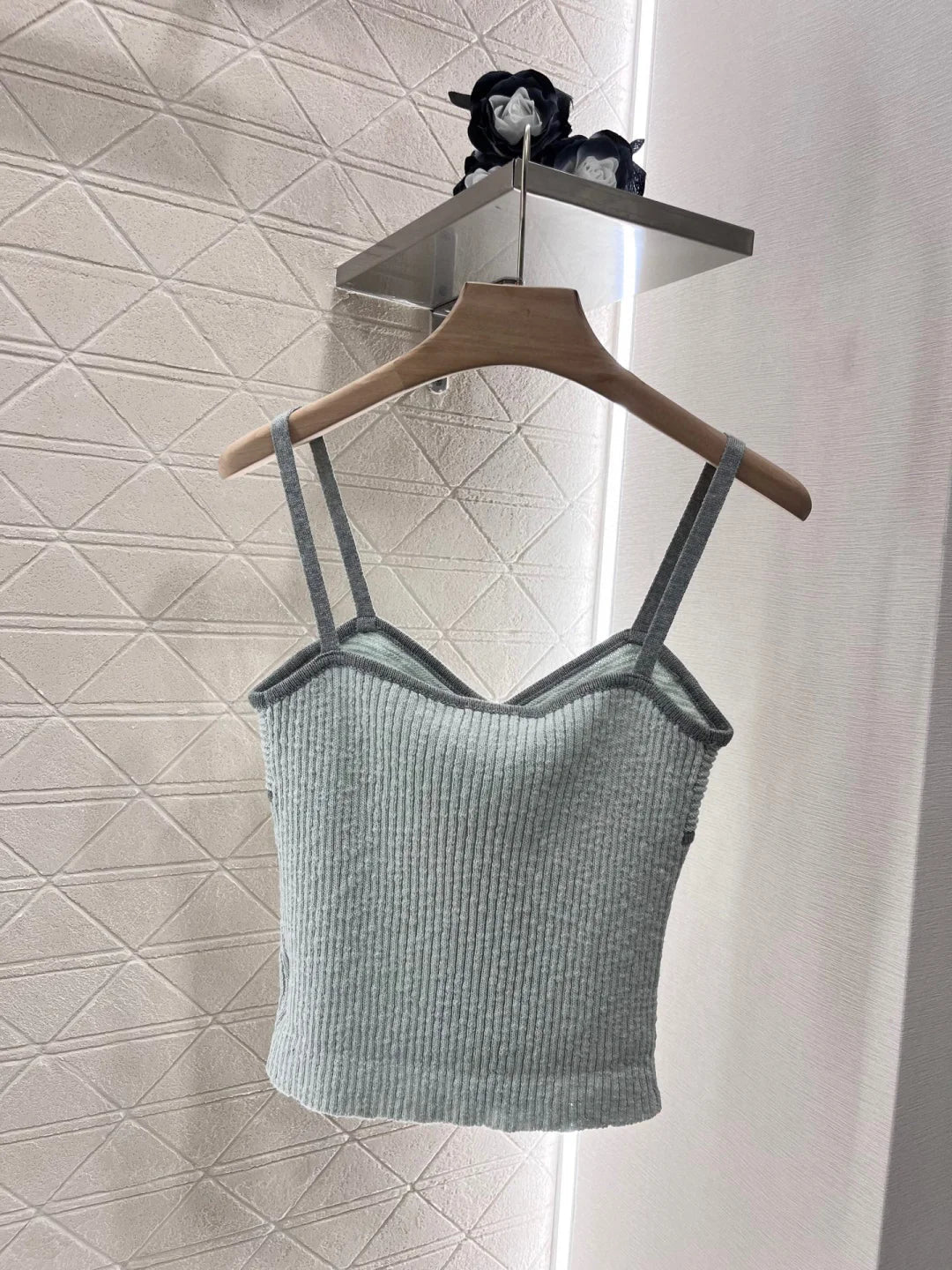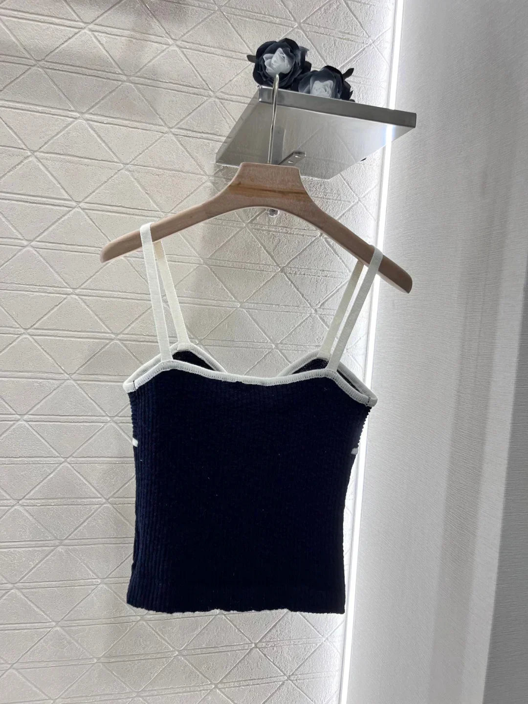 Wool yarn weaving, skin-friendly and comfortable, stretchy and easy to wear. Camisole style. Slender suspenders modify the beautiful lines of the shoulders. A lace-up bow and double C logo are placed in the center of the chest. It is low-key and exquisite. The outline line and the body form a color collision. It is matched with pitted texture to add layering to the look. Sexy and charming.