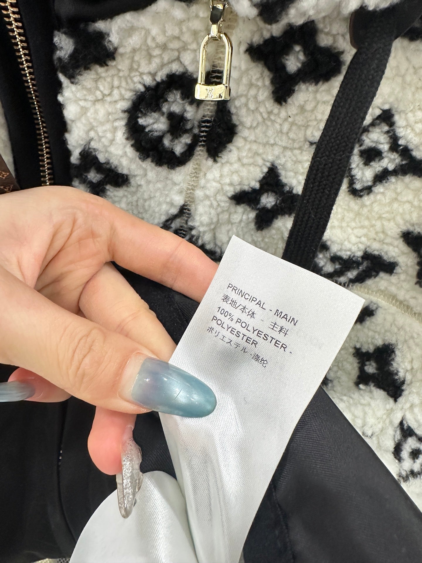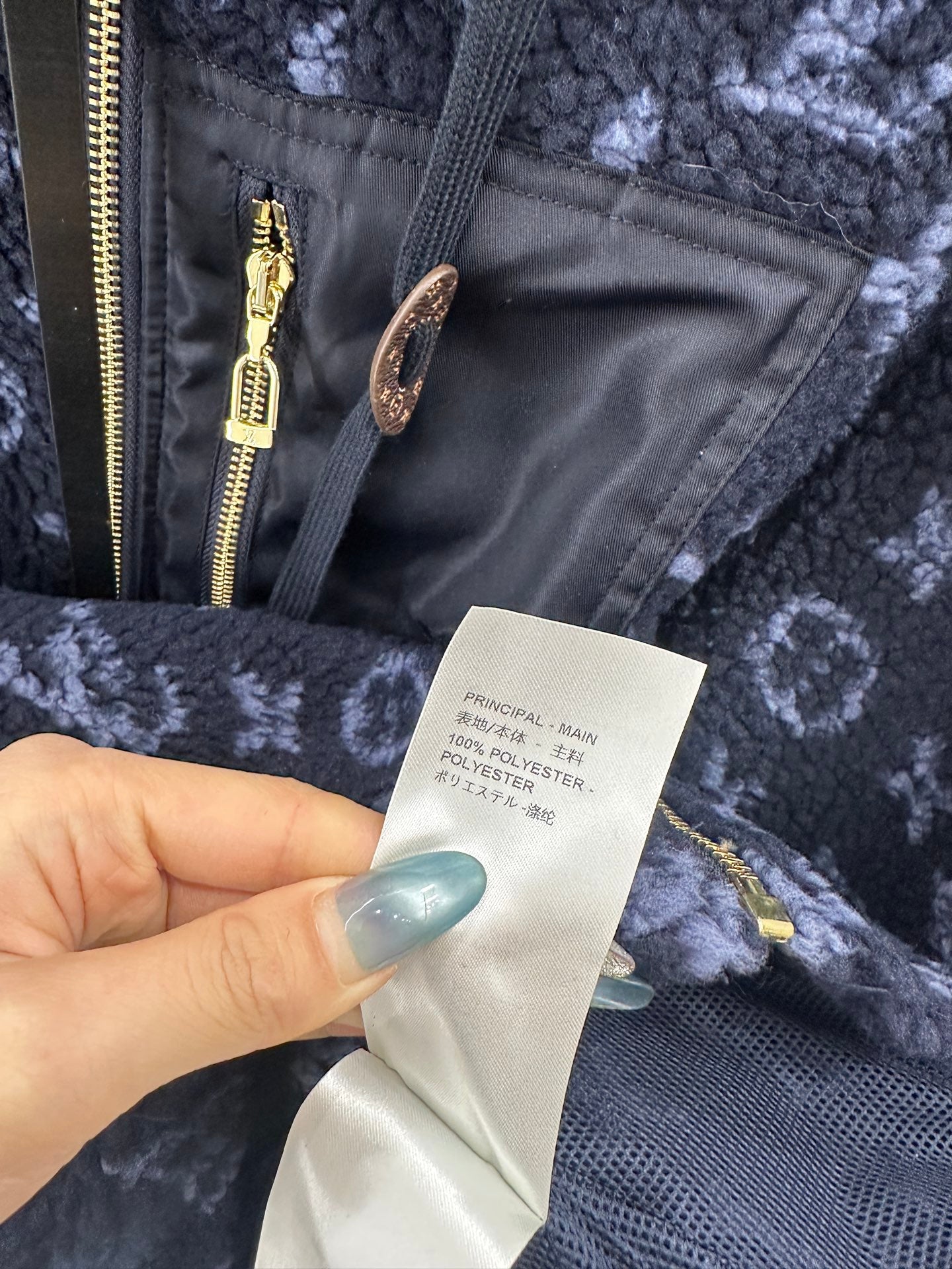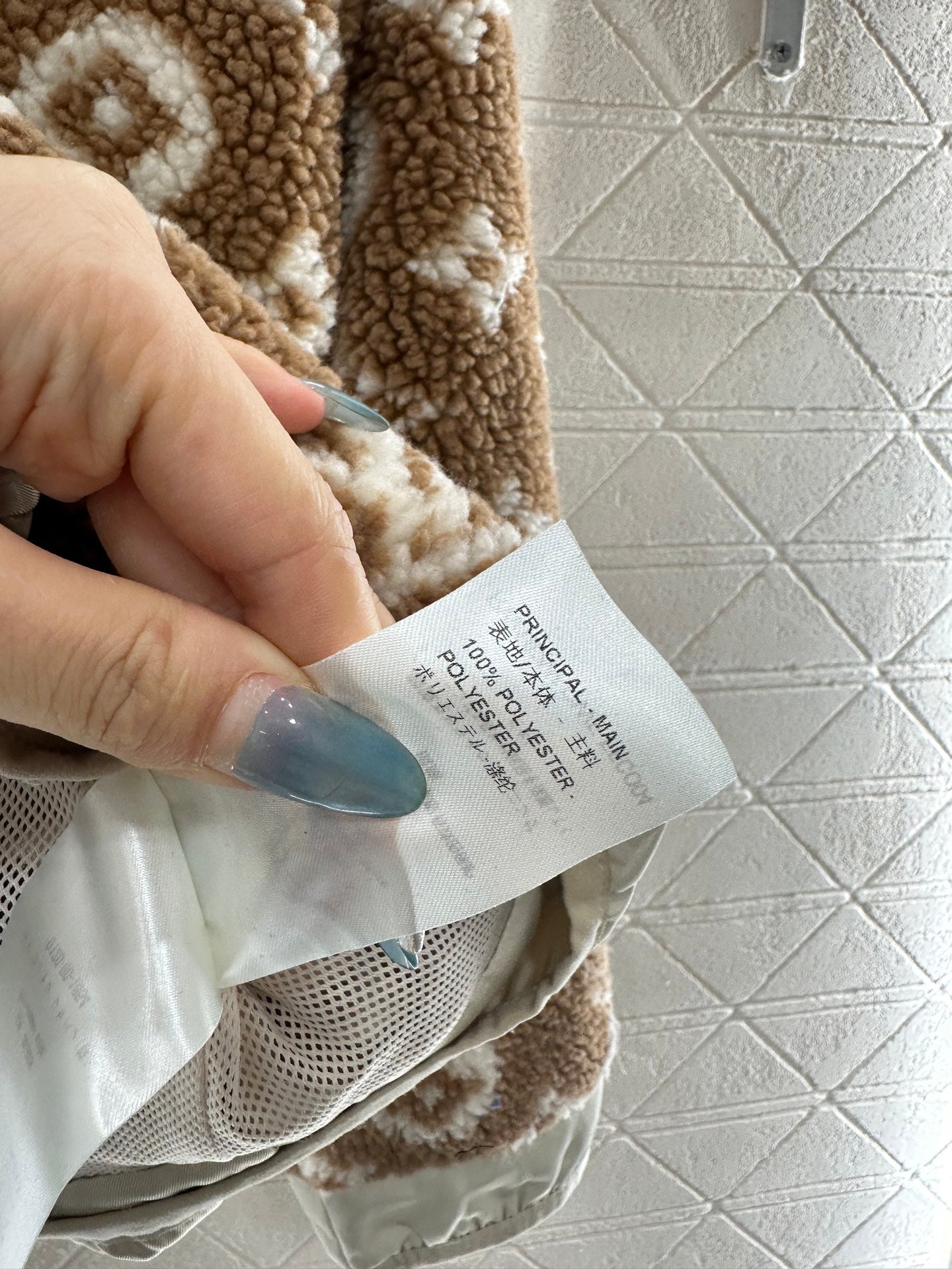 Product Description: Made of Teddy Sherpa fleece with ample fleece for windproof warmth, this jacket features a hooded vest design. The sherpa fleece is textured throughout for warmth and comfort, with a contrasting color scheme and accented with four-leaf clover lettering. Nylon hemming and monogrammed leather buckles provide intricate details.
