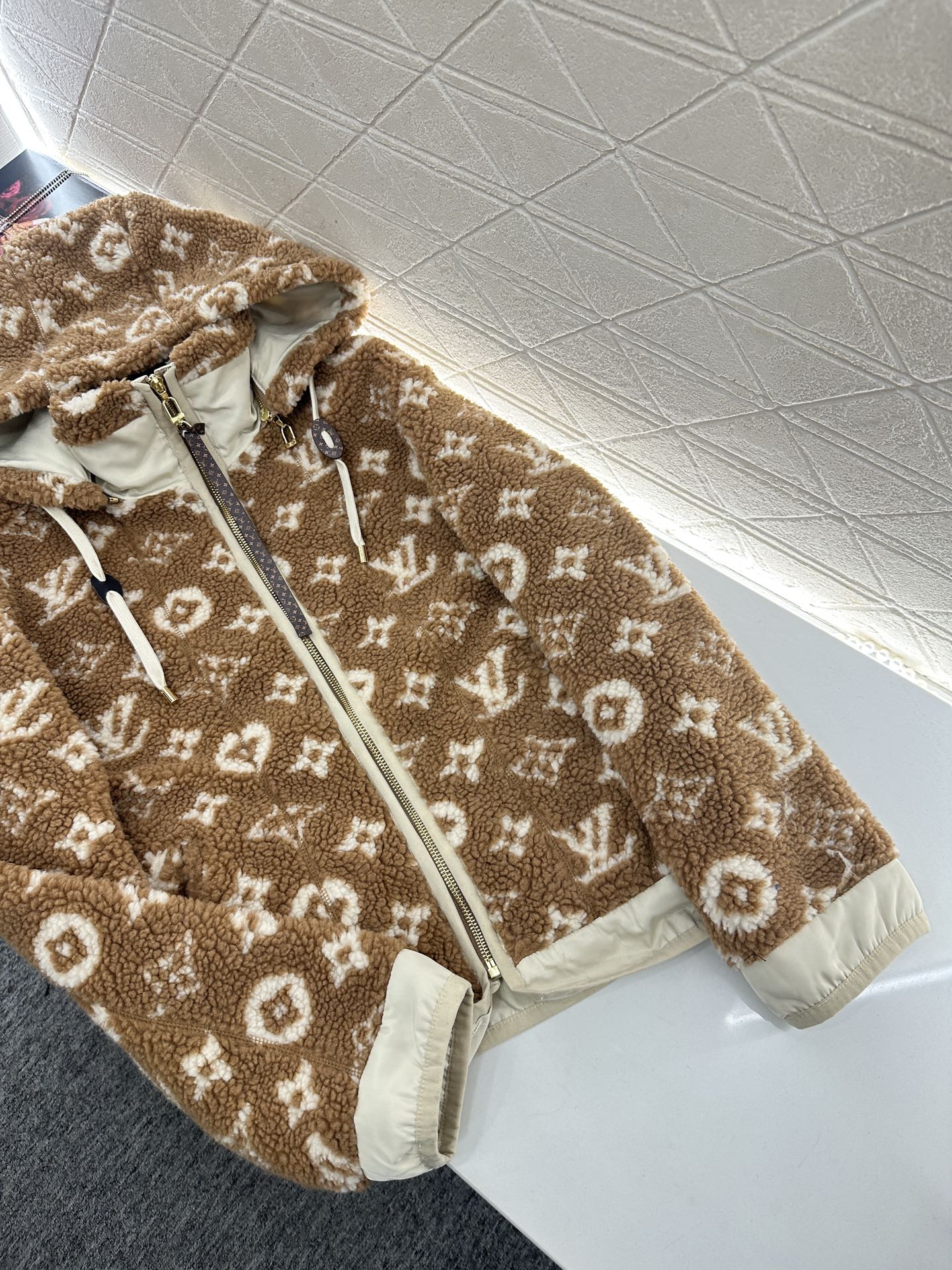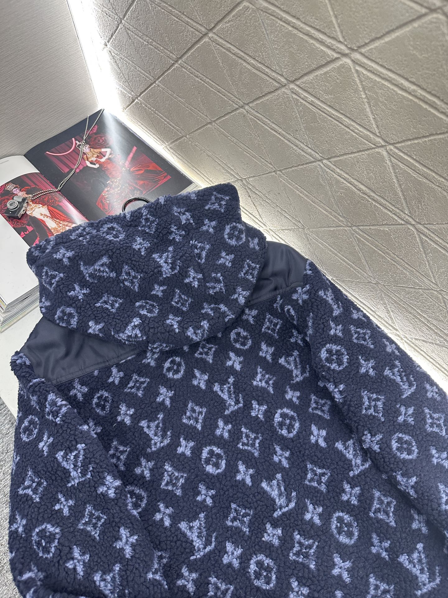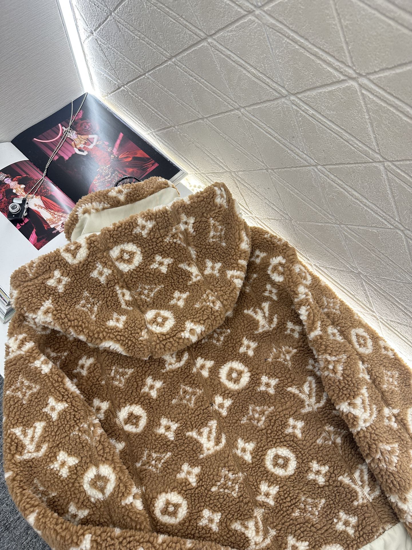 Product Description: Made of Teddy Sherpa fleece with ample fleece for windproof warmth, this jacket features a hooded vest design. The sherpa fleece is textured throughout for warmth and comfort, with a contrasting color scheme and accented with four-leaf clover lettering. Nylon hemming and monogrammed leather buckles provide intricate details.