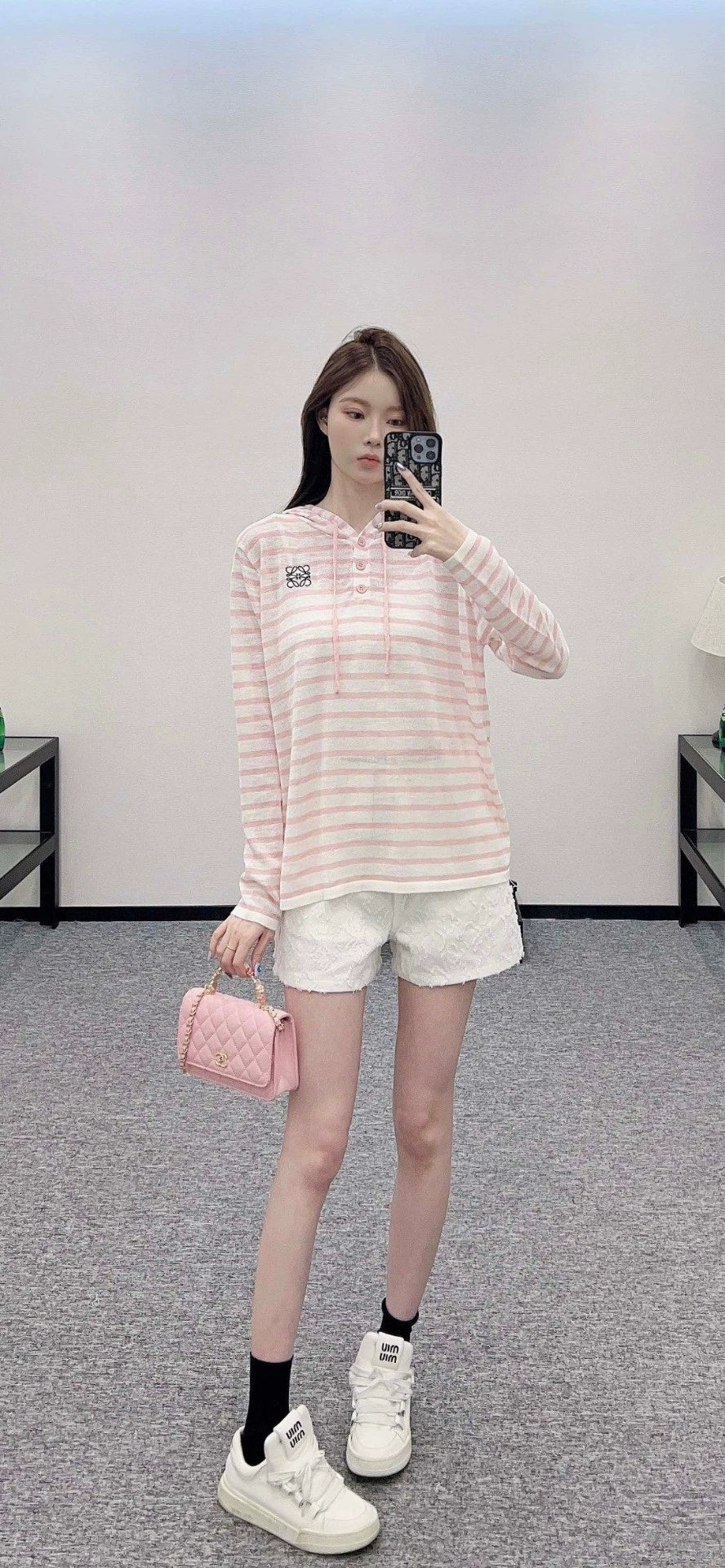 Imported yarn weaving texture advanced wear loose Hooded knit sun shirt cut Pullover with buttons half placket design easier to put on and take off Body two-color stripes interweave chest color embellishment totem logo modeling to highlight the sense of wearing advanced Lightweight blouse is more suitable for the spring and summer seasons Elastic elastic to show more delicate wear thin body shape to accommodate the body to show the loose tone Four seasons fashion wear preferred