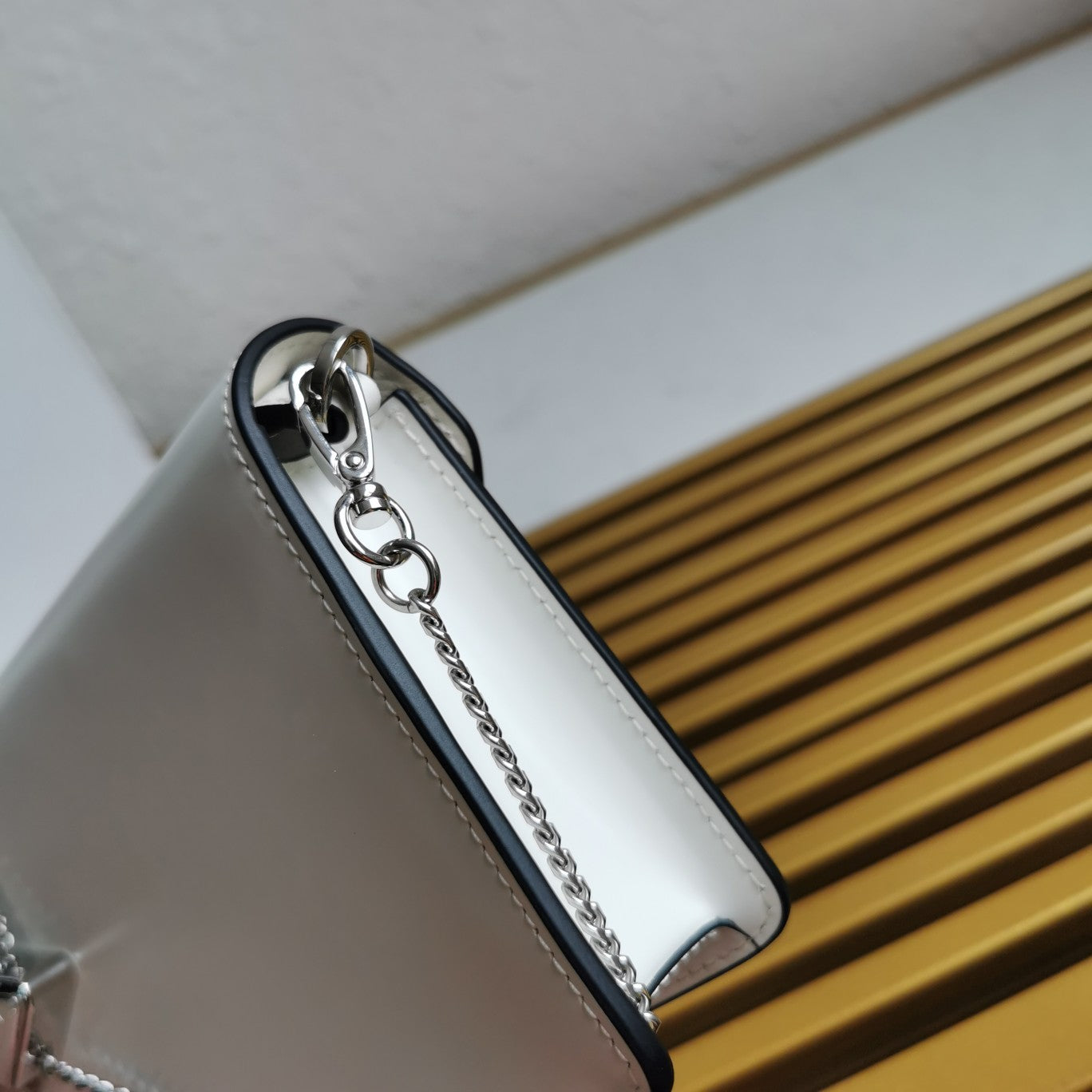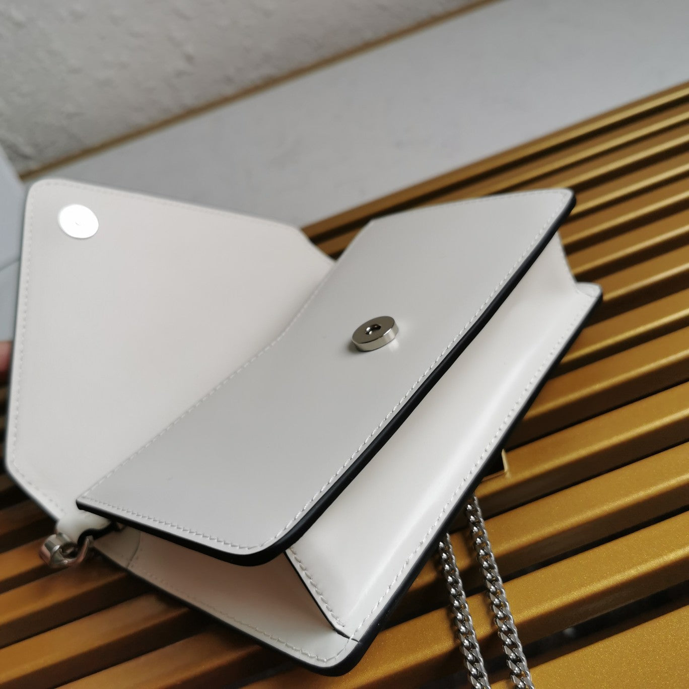 Large triangular logo, originally designed by Mario, characterizes the bag's trendy style, with an adjustable and detachable chain shoulder strap (110cm).