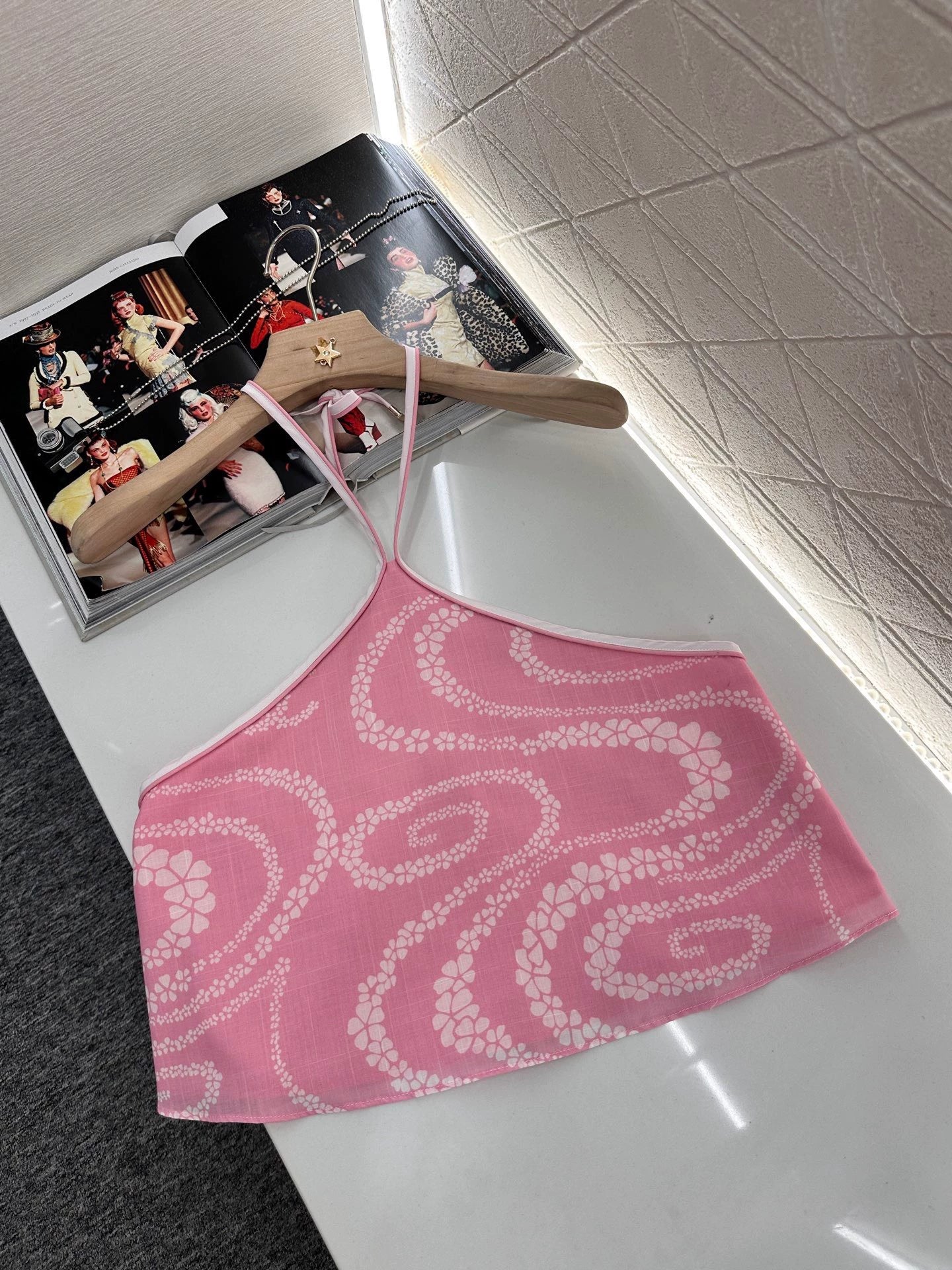 Customized YB imported twill material, refreshing and breathable, soft and skin-friendly, showing a light and slightly transparent texture. Halter vest with waist-side tie straight mid-length skirt set. Irregular camellia pattern printed all over the body, interspersed with double C logo, highlighting the brand style. Complex visual effects, creating a romantic and aesthetic style, full of personality and creativity. Short top and long bottom, modifying the body shape and beautifying the proportion. The degree of skin exposure makes the holiday feel full. The first choice for refreshing summer. Customized surface and accessories. Look for the version. High version